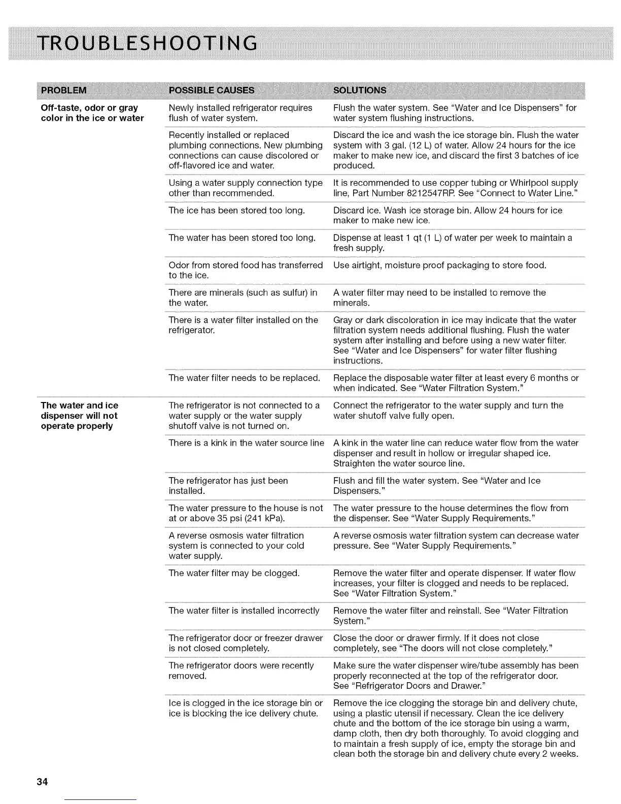Off-taste, odor or gray Newly installed refrigerator requires Flush the water system. See "Water and Ice Dispensers" for