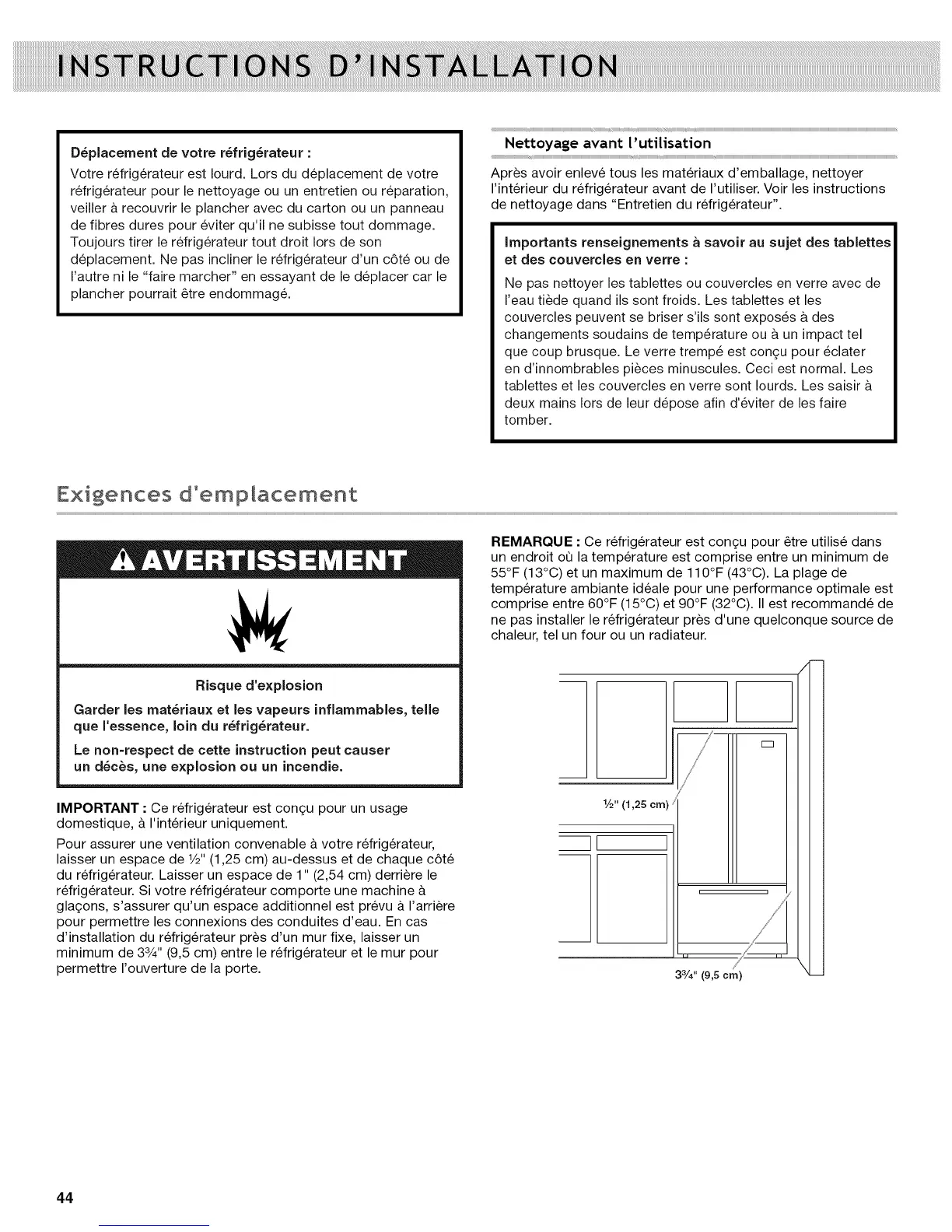 minimum de 33/4"(9,5 cm) entre le refrigerateur et lemur pour
