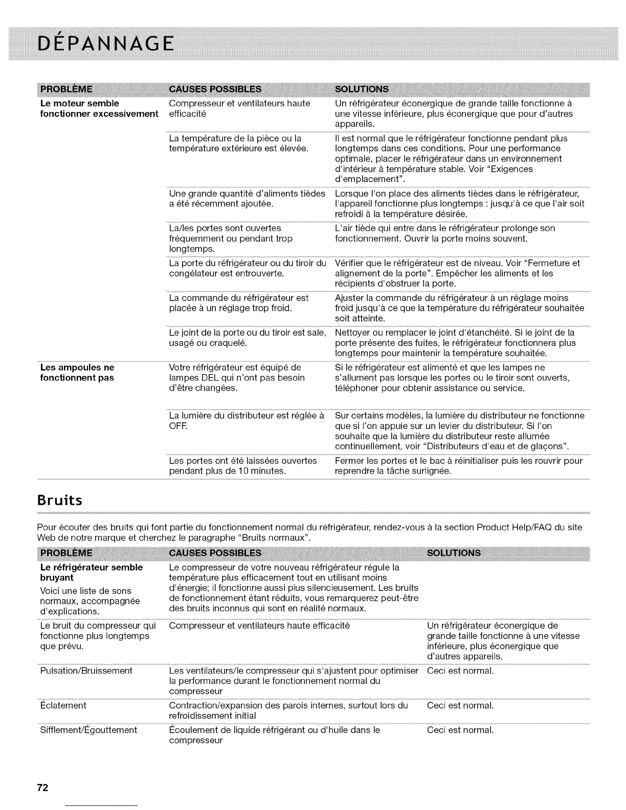Pour ecouter des bruits qui font partie du fonctionnement normal du refrigerateur, rendez-vous a la section Product Help/FAQ du site