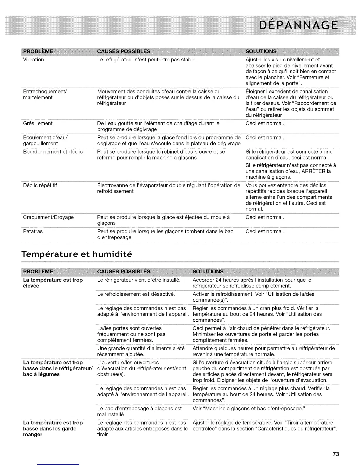 Vibration Le refrig6rateur n'est peut-_tre pas stable Ajuster les vis de nivellement et