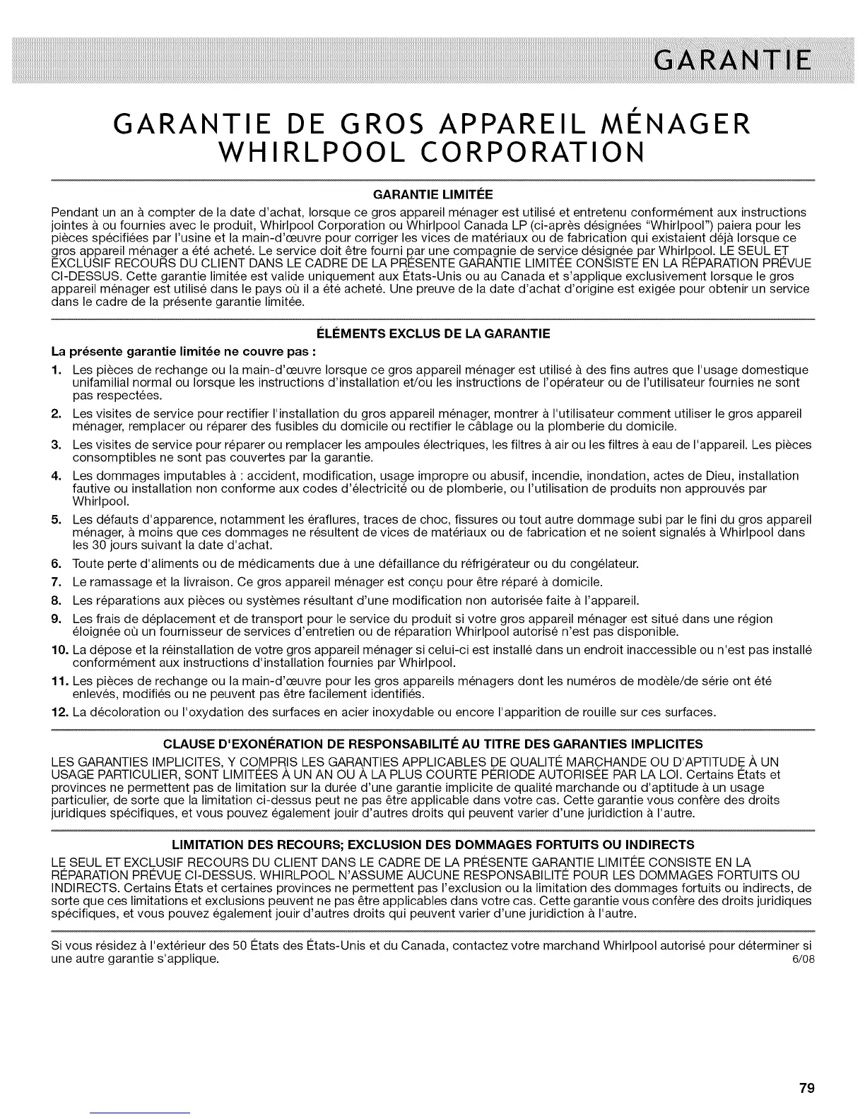 Si vous residez & I'exterieur des 50 12tatsdes 12tats-Unis et du Canada, contactez votre marchand Whirlpool autorise pour determiner si