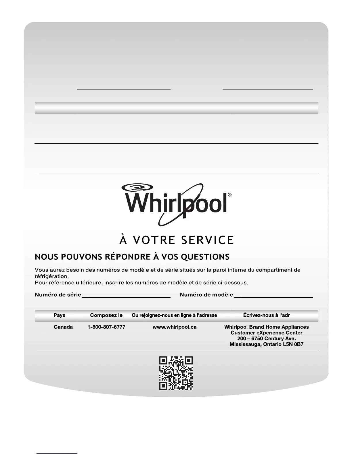 Canada 1-800-807-6777 www.whirlpool.ca Whirlpool Brand Home Appliances