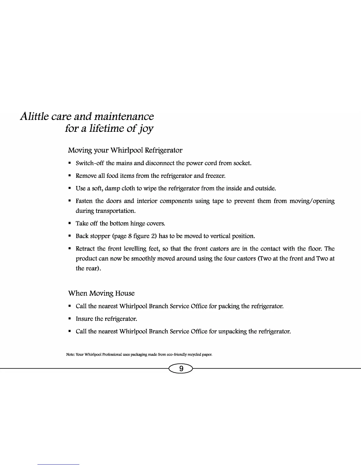 Whirlpool WRID41T - Moving Your Whirlpool Refrigerator; When Moving House