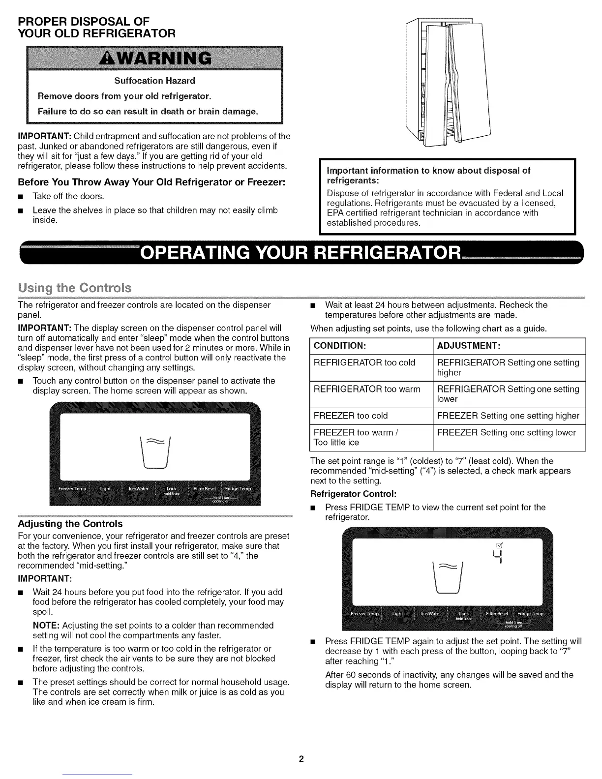 REFRIGERATOR too cold REFRIGERATOR Setting one setting
