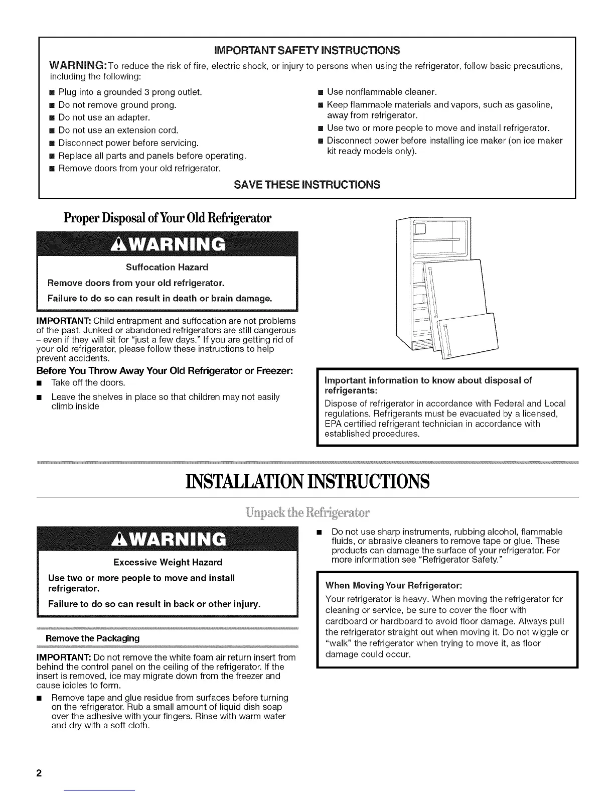 • Use two or more people to move and install refrigerator.