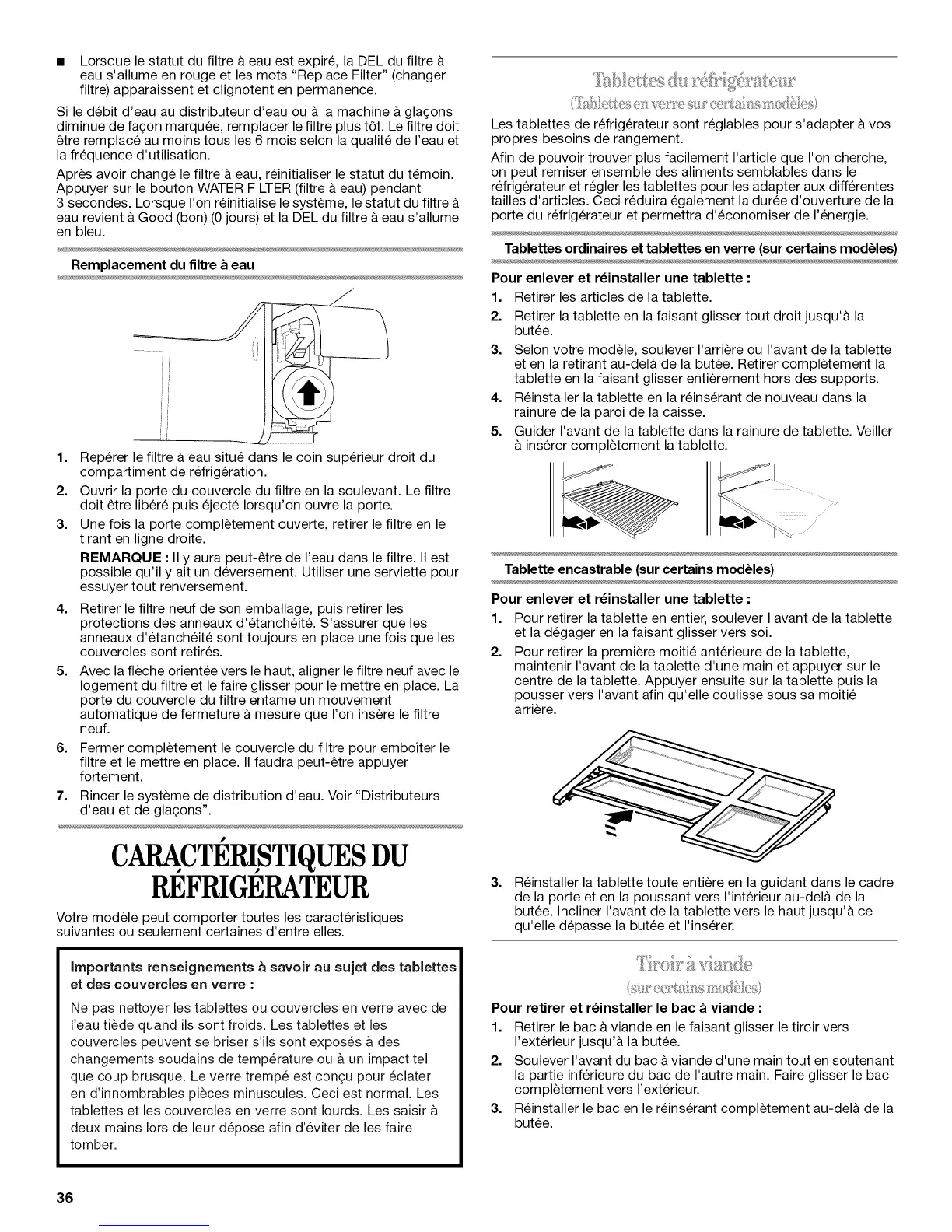 tablettes et les couvercles en verre sont Iourds. Les saisir