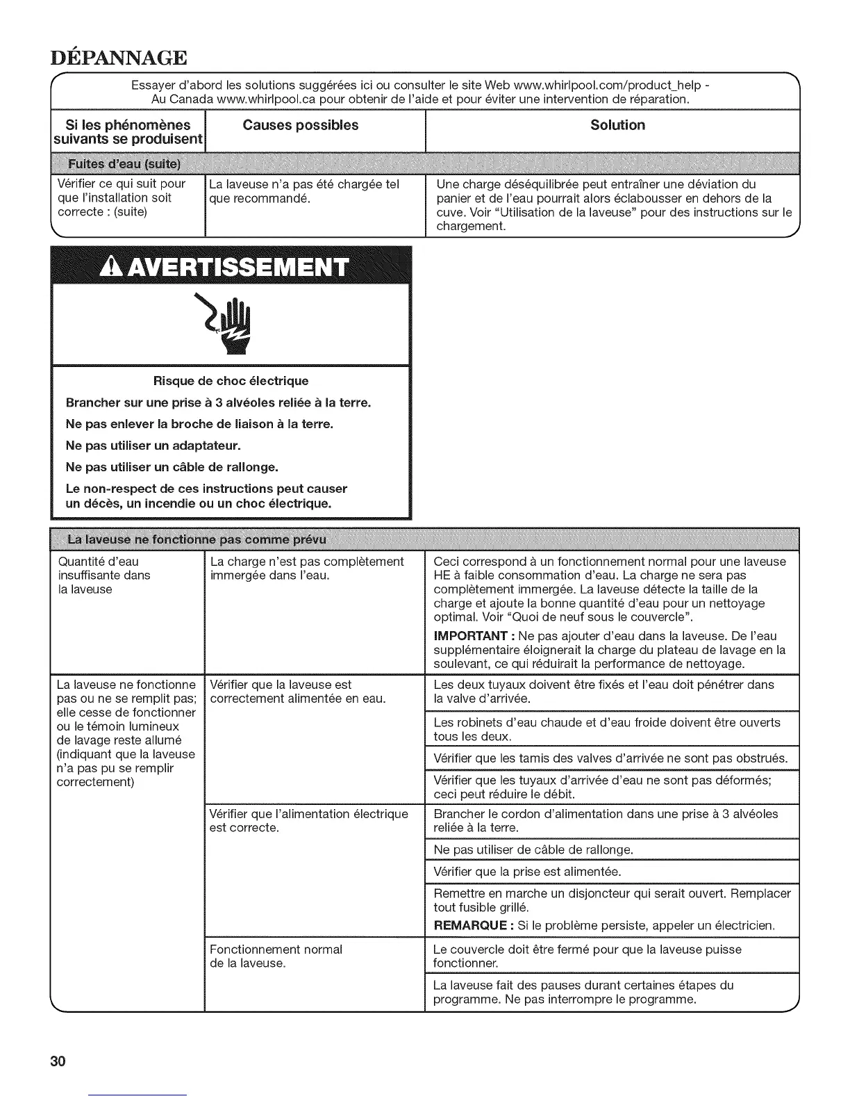 Essayer d'abord les solutions sugg6r6es ici ou consulter le site Web www.whirlpool.com/product_help -