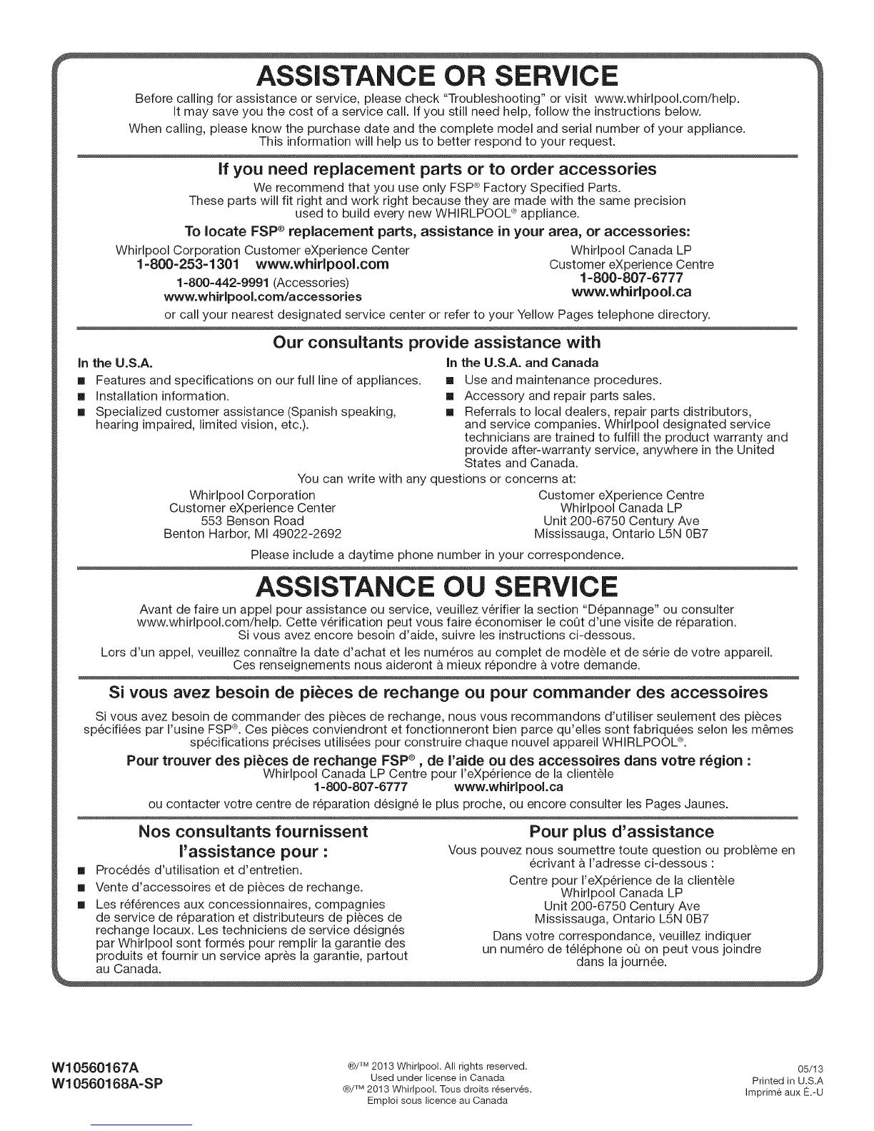 W10560167A ®/ 2013 Whirlpool. All rights reserved. 05/13