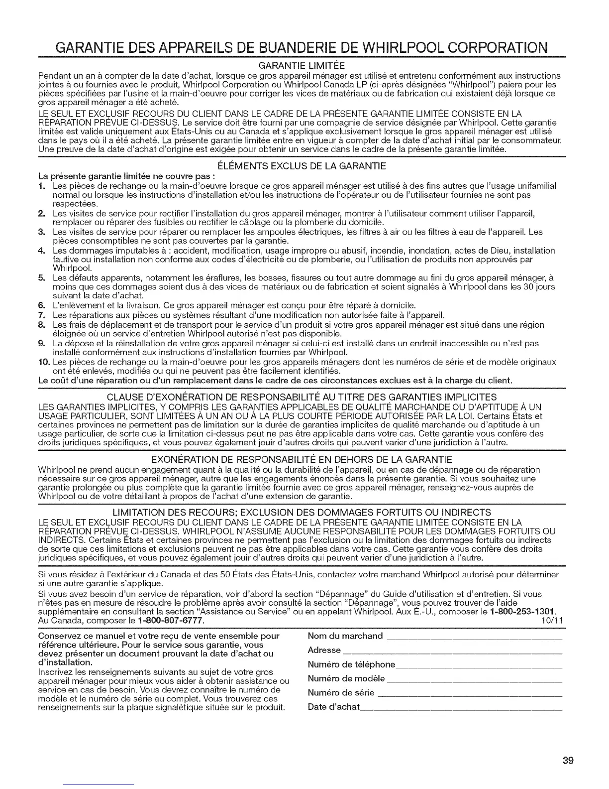 GARANTIE DES APPAREILS DE BUANDERIE DE WHIRLPOOL CORPORATION