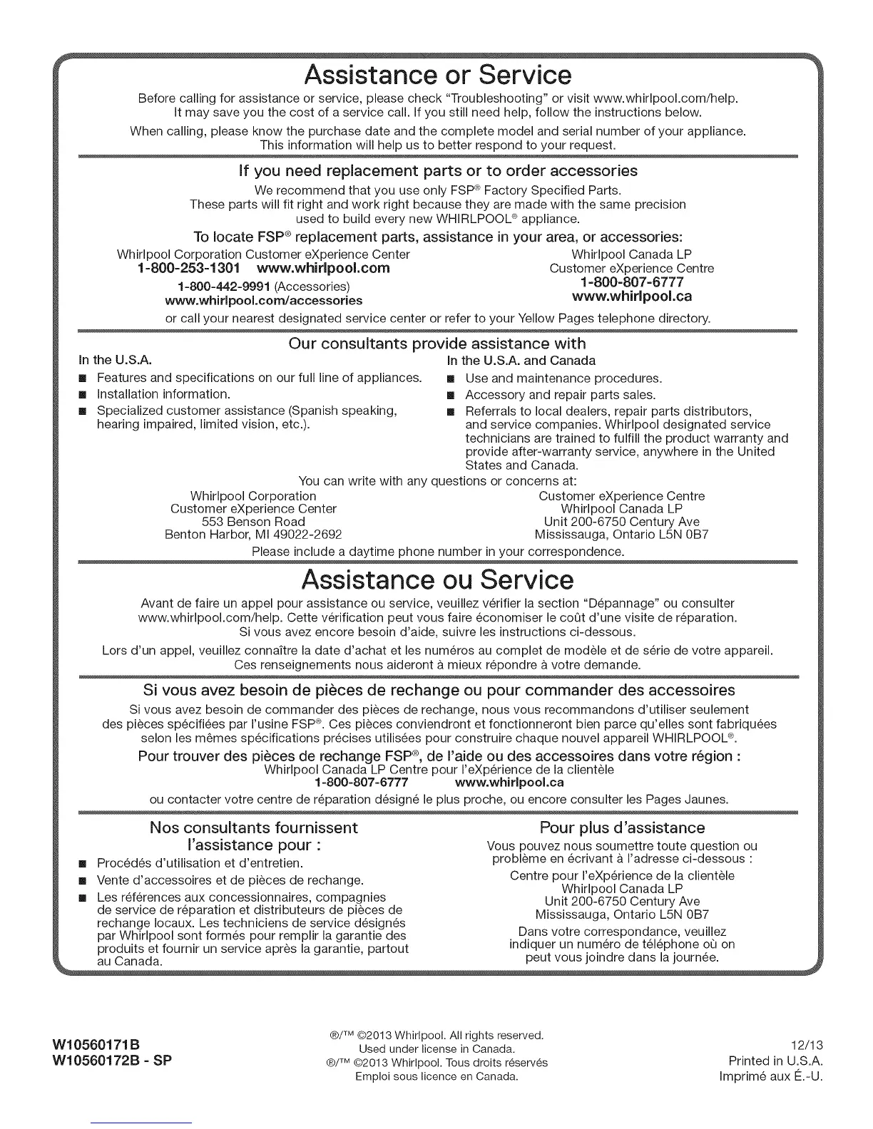 Before calling for assistance or service, please check "Troubleshooting" or visit www.whirlpool.com/help.