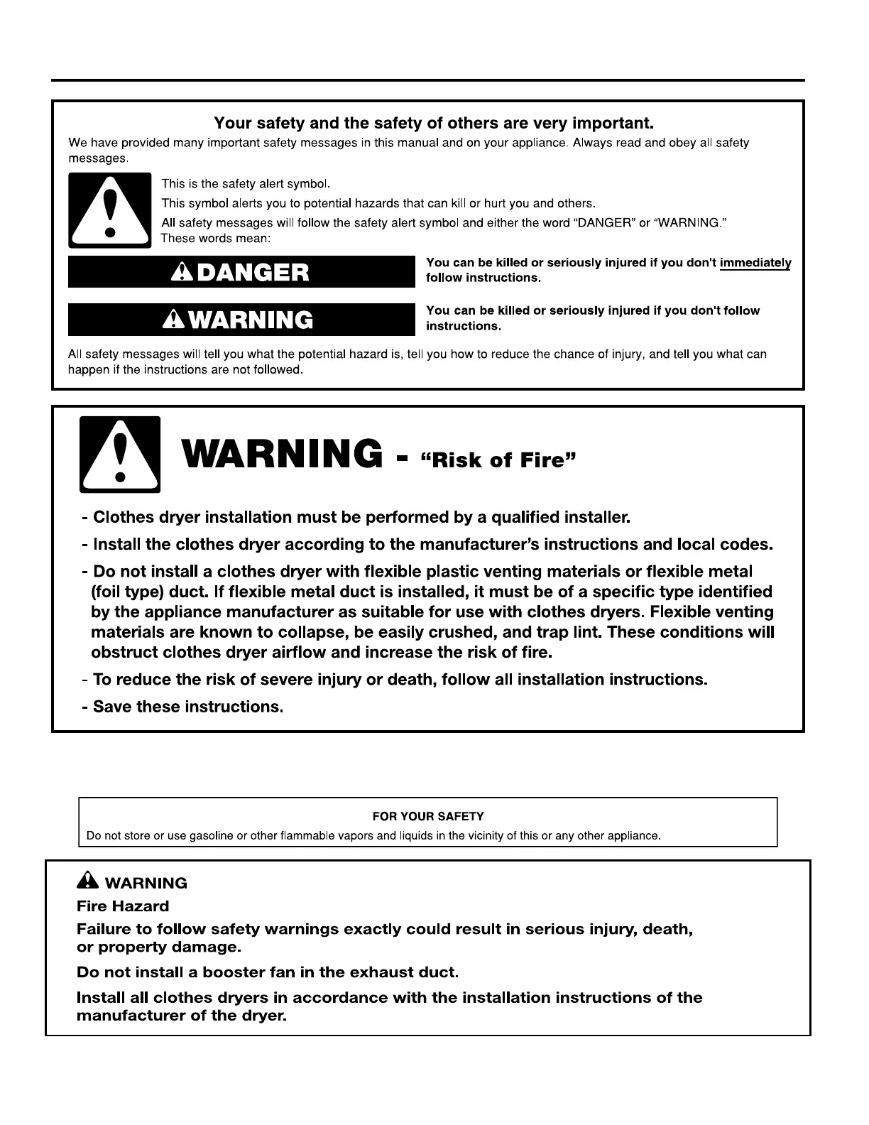 Whirlpool YCEM2765FQ - DRYER SAFETY; Critical Safety Warnings (Fire Hazard)