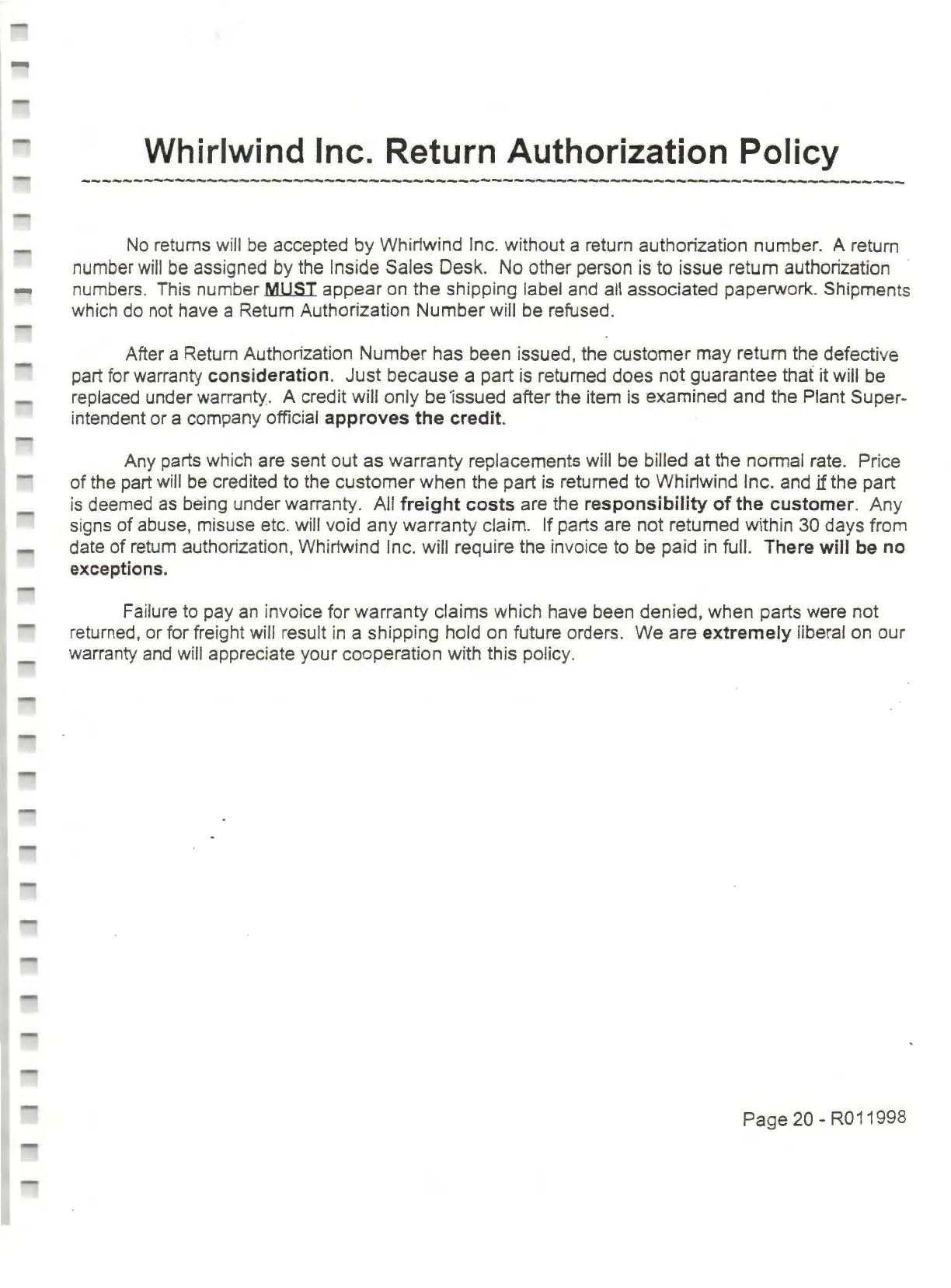 accepted by Whirlwind Inc. without a return authorization number. A return
