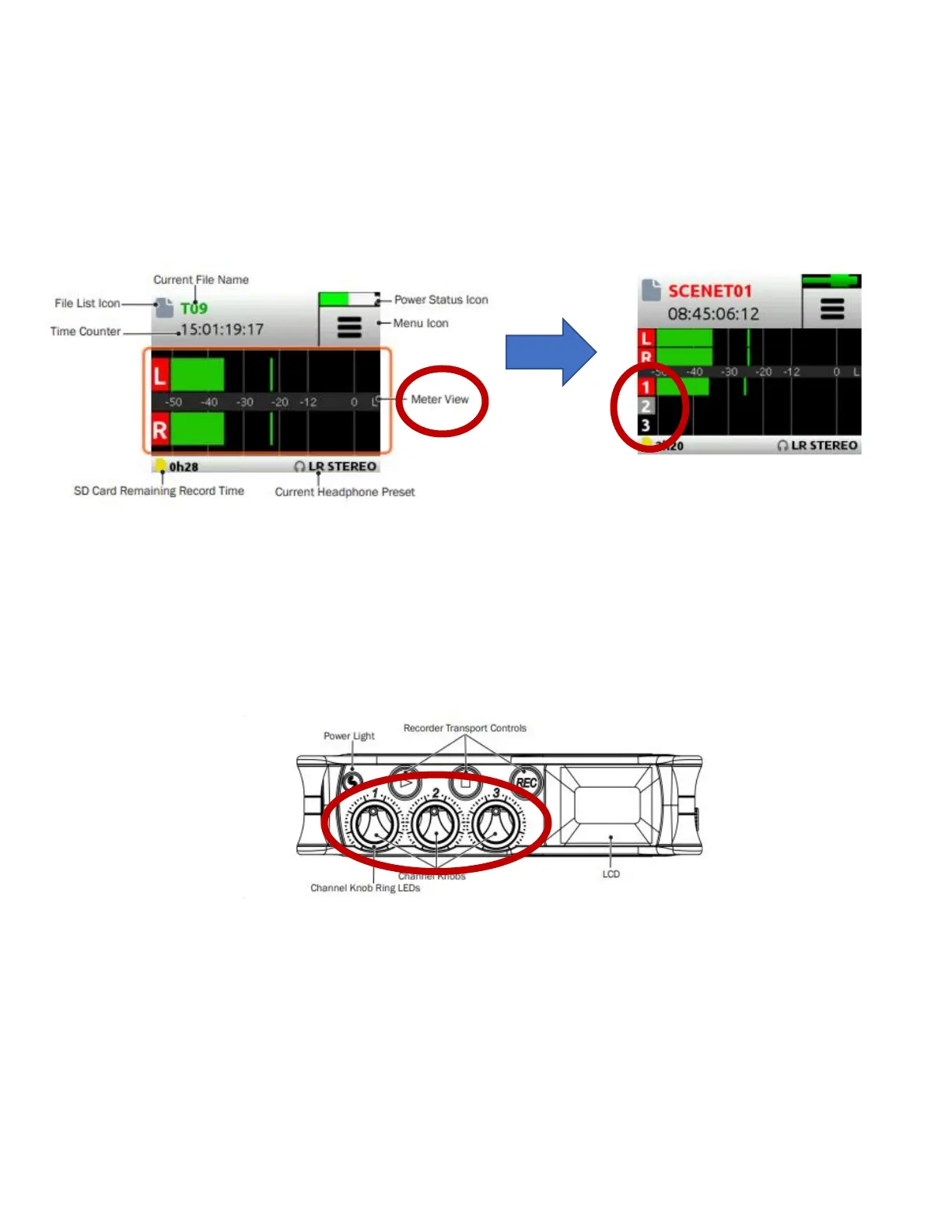 4) Now that you have your microphone(s) plugged in, go back to the metering page on the LCD screen.
