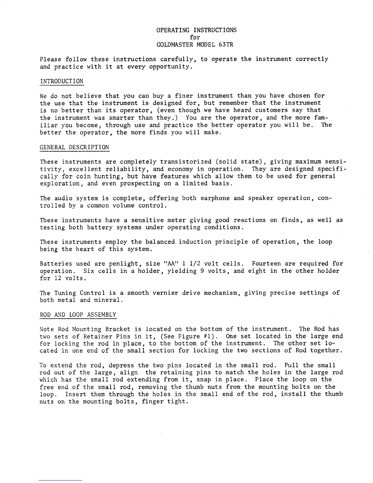 White's Goldmaster 63TR - Operating Instructions; Introduction; General Description; Rod and Loop Assembly