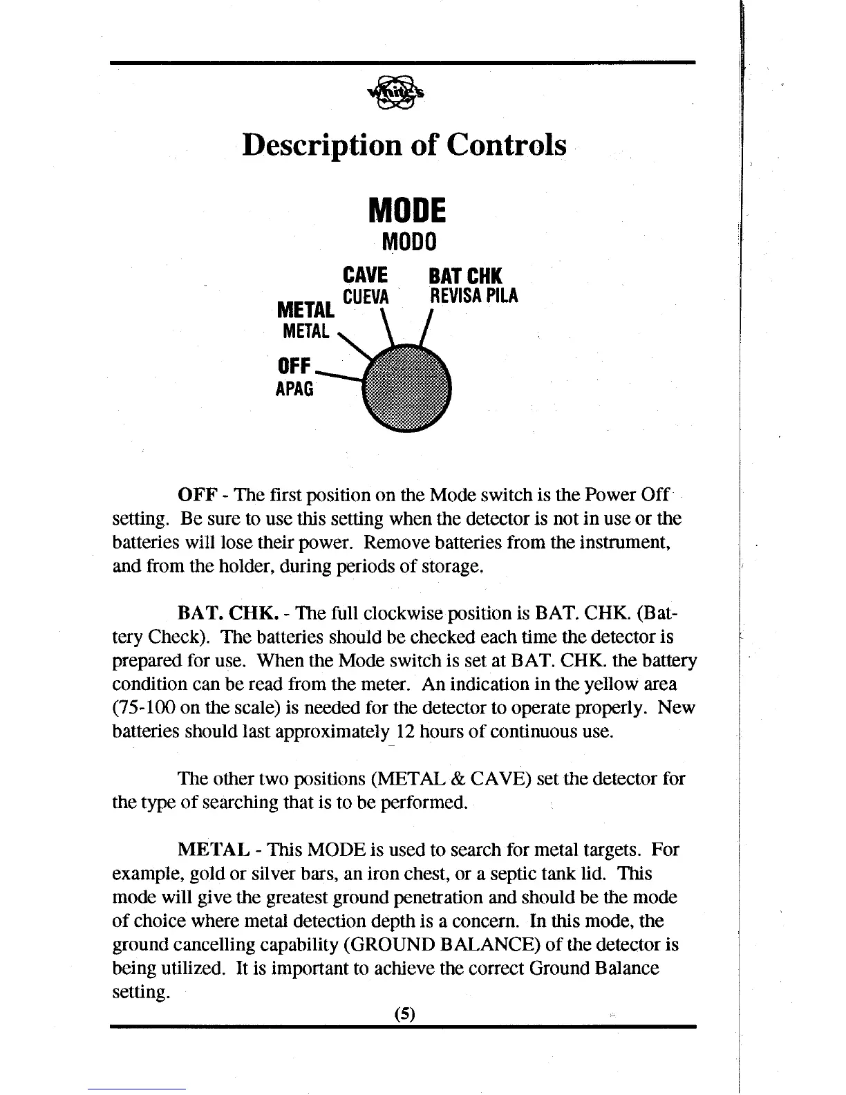 White's TM 808 - Description of Controls; Mode Selection