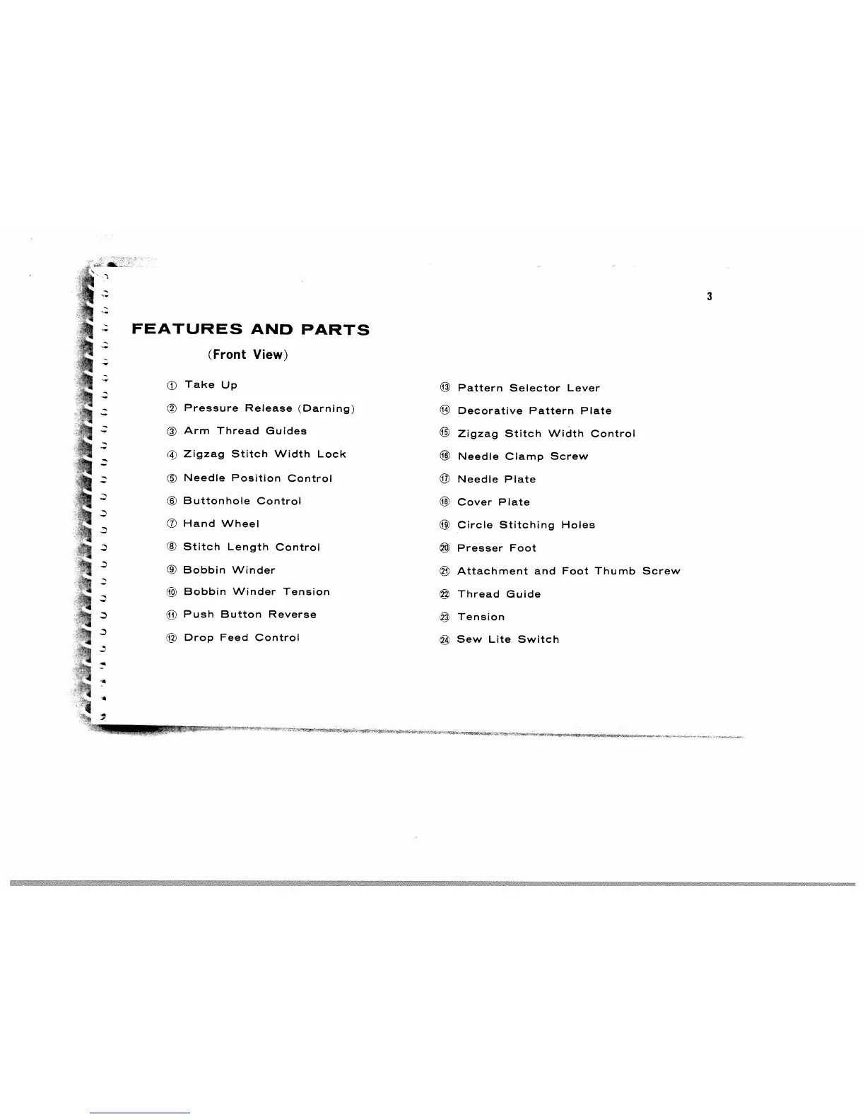 White Sewing 793 - Features and Parts (Front View); Needle Position Control; Stitch Length Control; Presser Foot