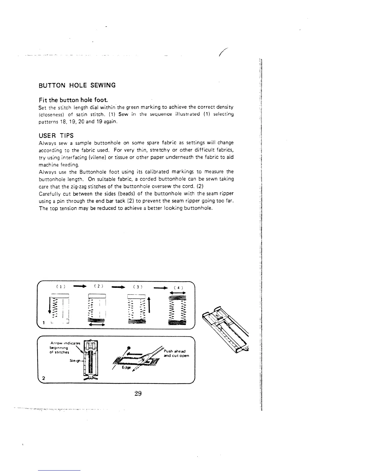 White 1000 - BUTTON HOLE SEWING; USER TIPS FOR BUTTONHOLES