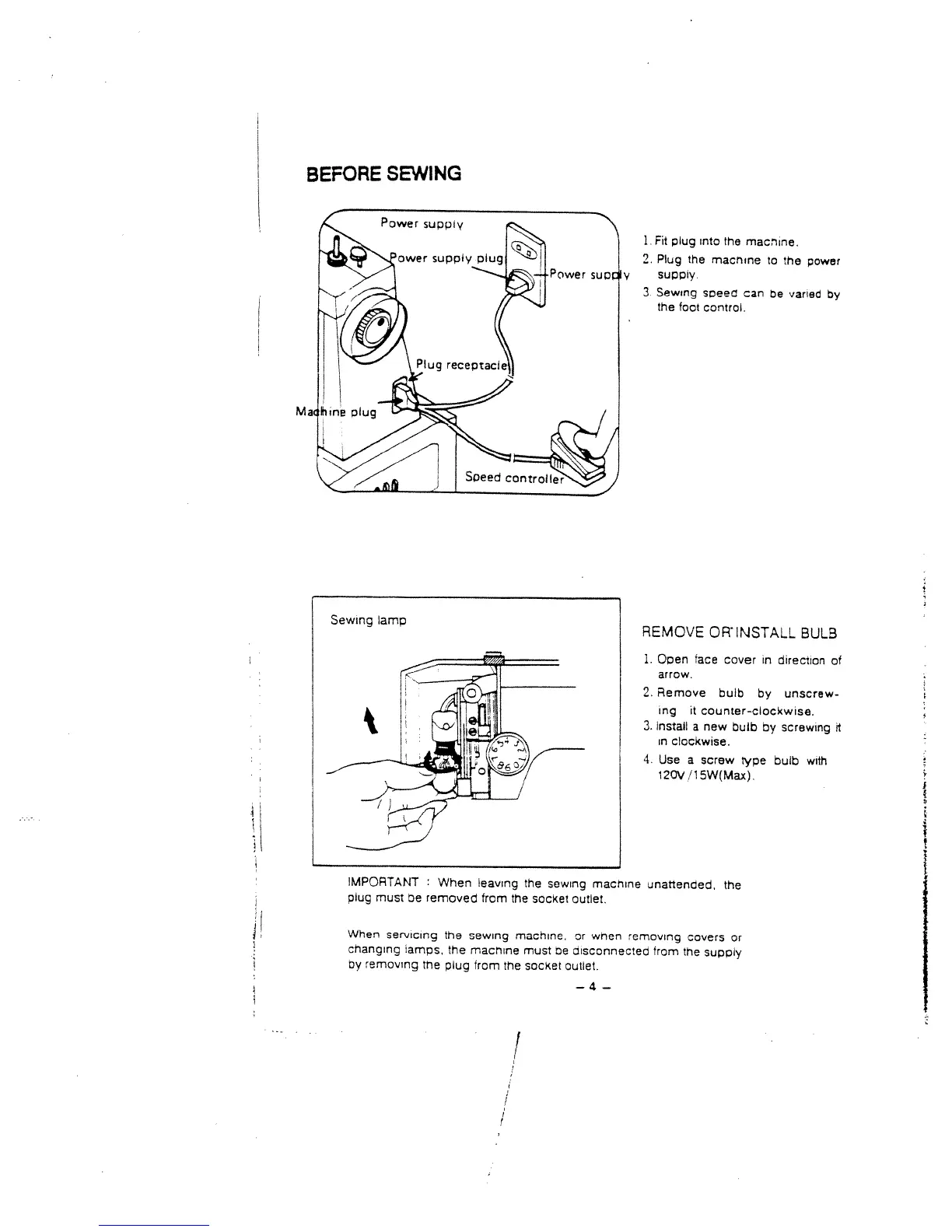 White 1409 white - Initial Sewing Machine Setup; Power Connection and Speed Control
