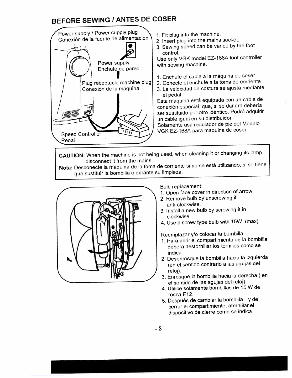 White 1521 - Before Sewing and Setup; Power Connection and Speed Control; Safety Precautions and Bulb Replacement
