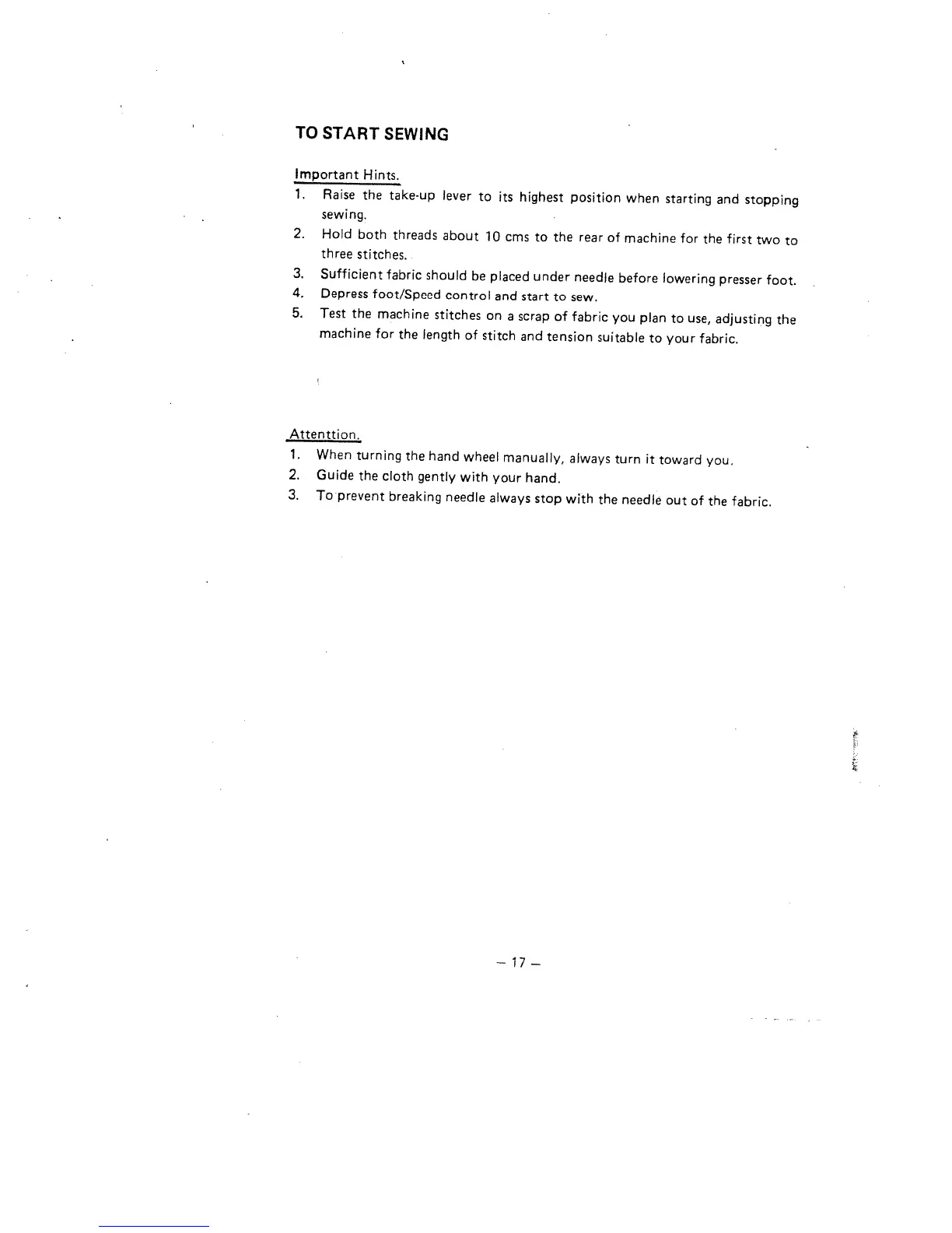 White 1620 - Starting Sewing Procedures; Important Starting Hints; Sewing Precautions