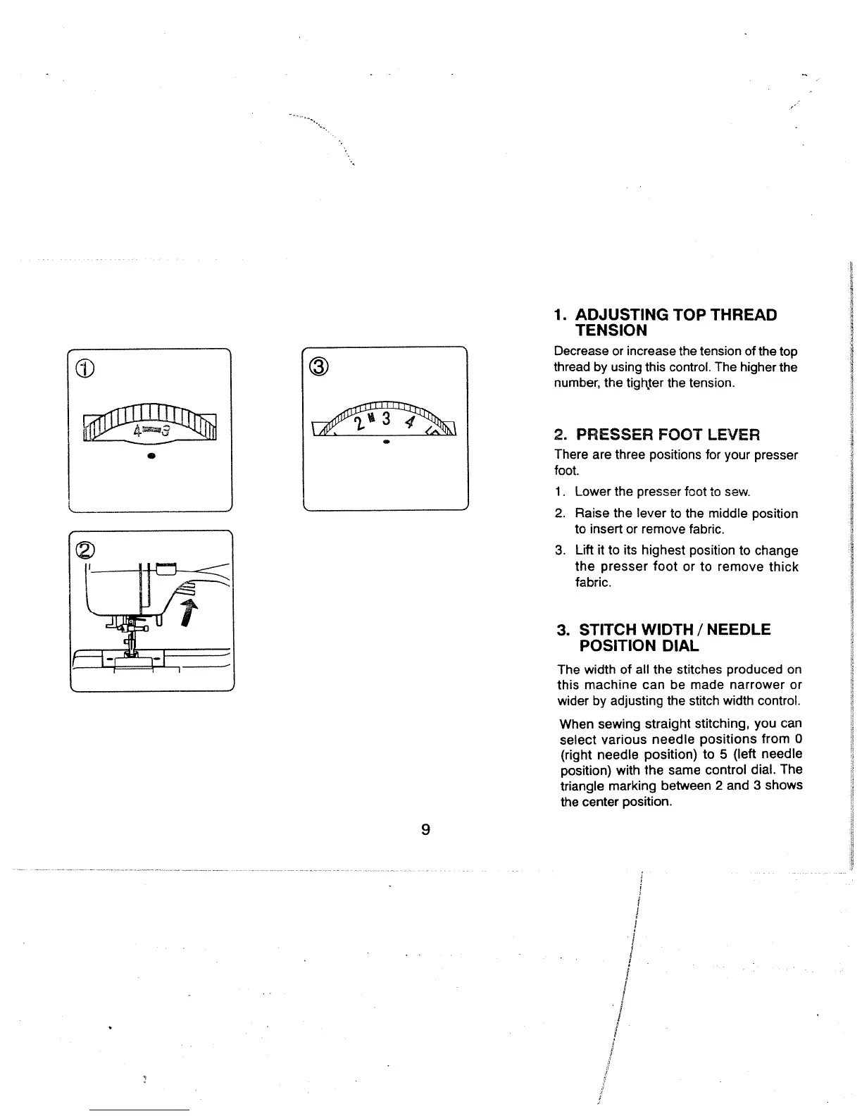White 1740 - Machine Controls and Settings; 1. Adjusting Top Thread Tension; 2. Presser Foot Lever Operation; 3. Stitch Width and Needle Position Dial