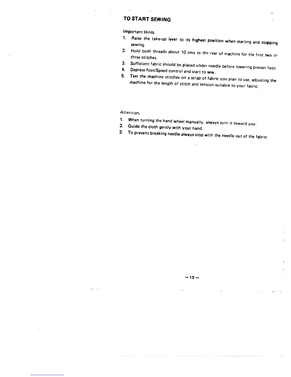 White 1855 - Starting the Sewing Process; Essential Hints for Starting Sewing; Manual Operation and Needle Safety