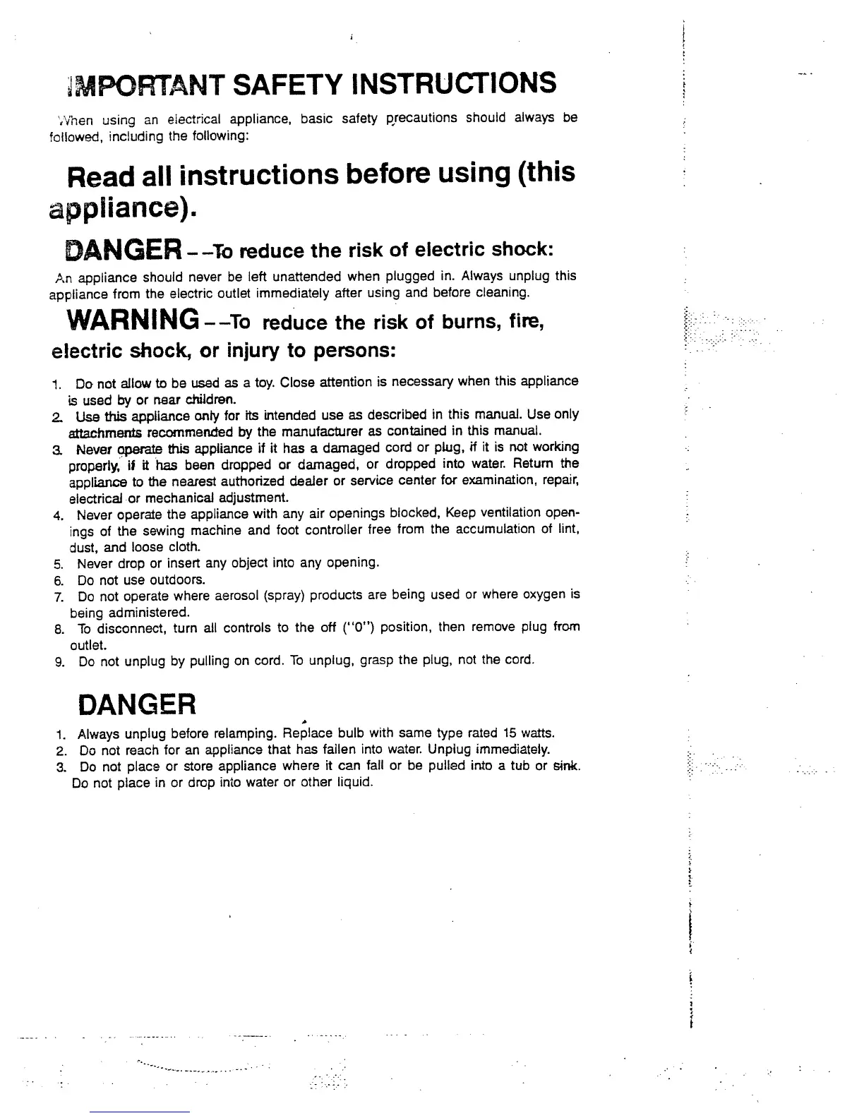 White 2221 - Important Safety Instructions; Electric Shock Dangers; General Operation Warnings