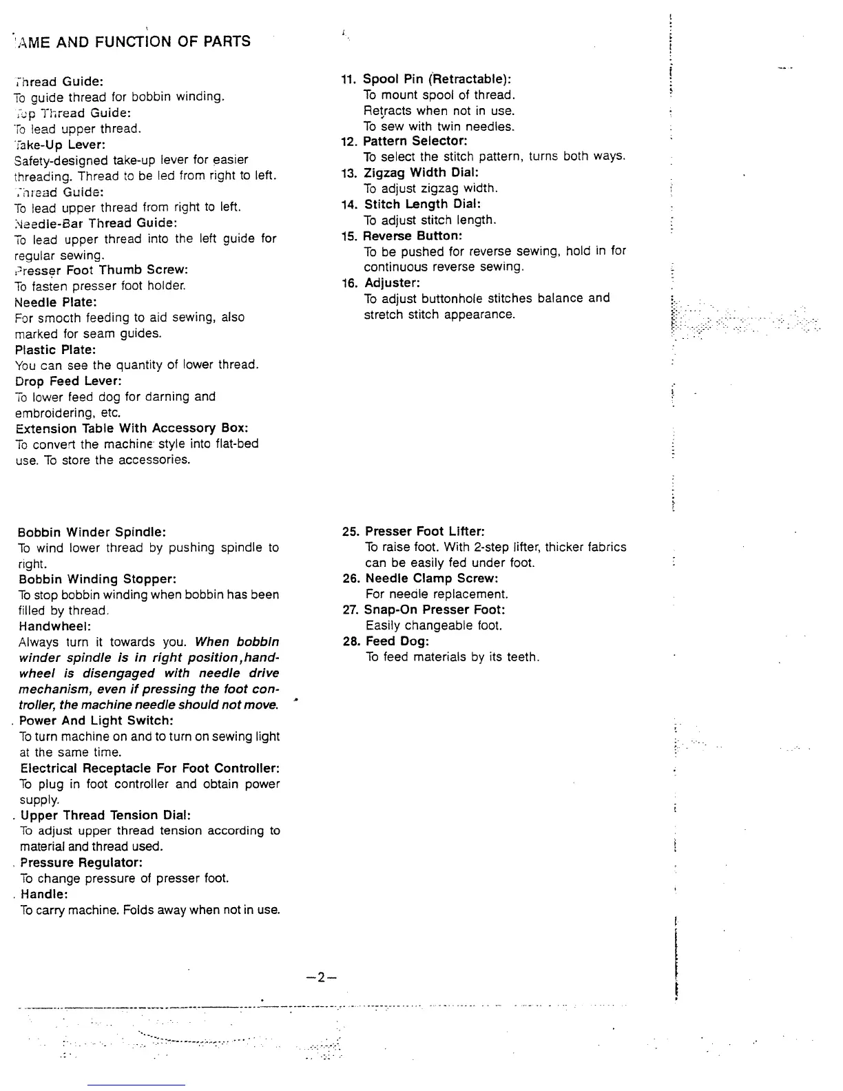 White 2221 - Name and Function of Parts; Machine Controls and Adjustments; Fabric Handling Parts