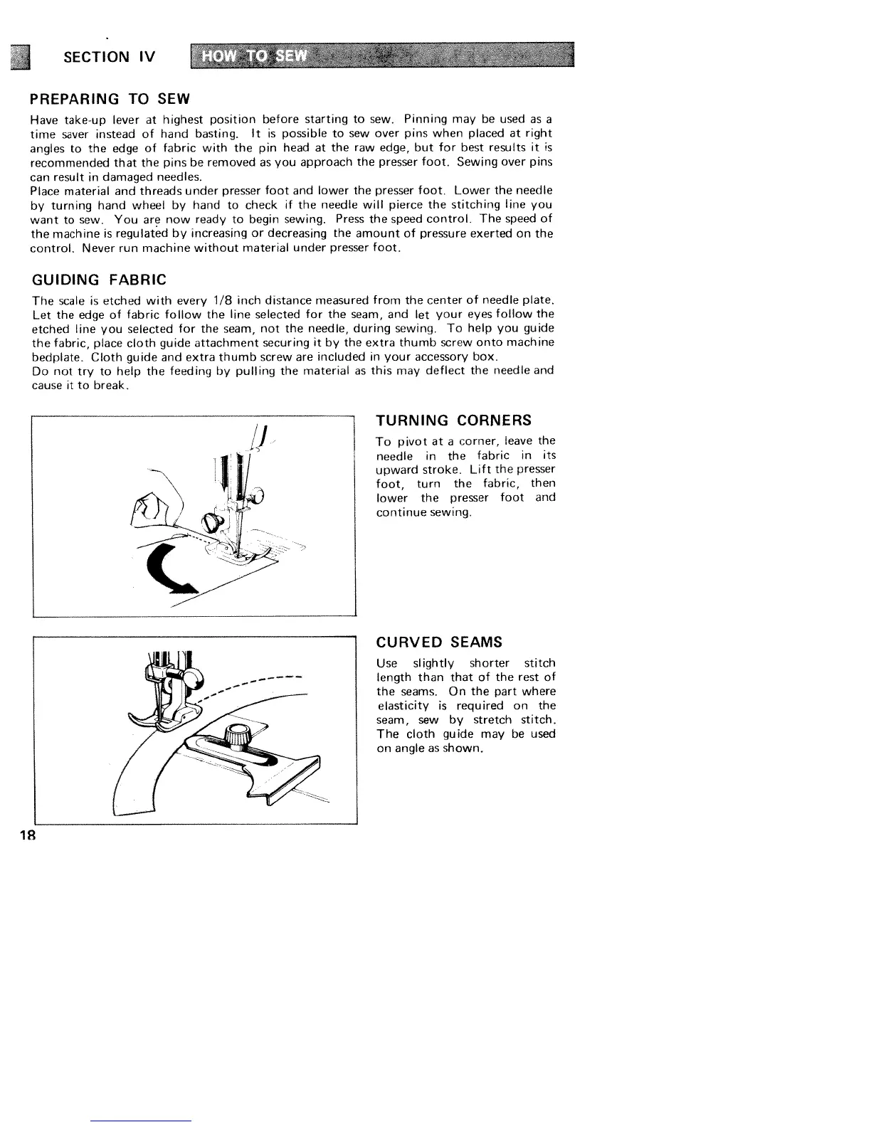 White 310 - Curved Seams; Guide the Fabric; Preparing to Sew; Turning Corners