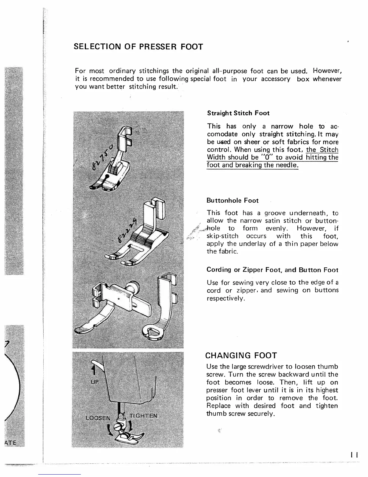 White 404 - SELECTION OF PRESSER FOOT; CHANGING FOOT