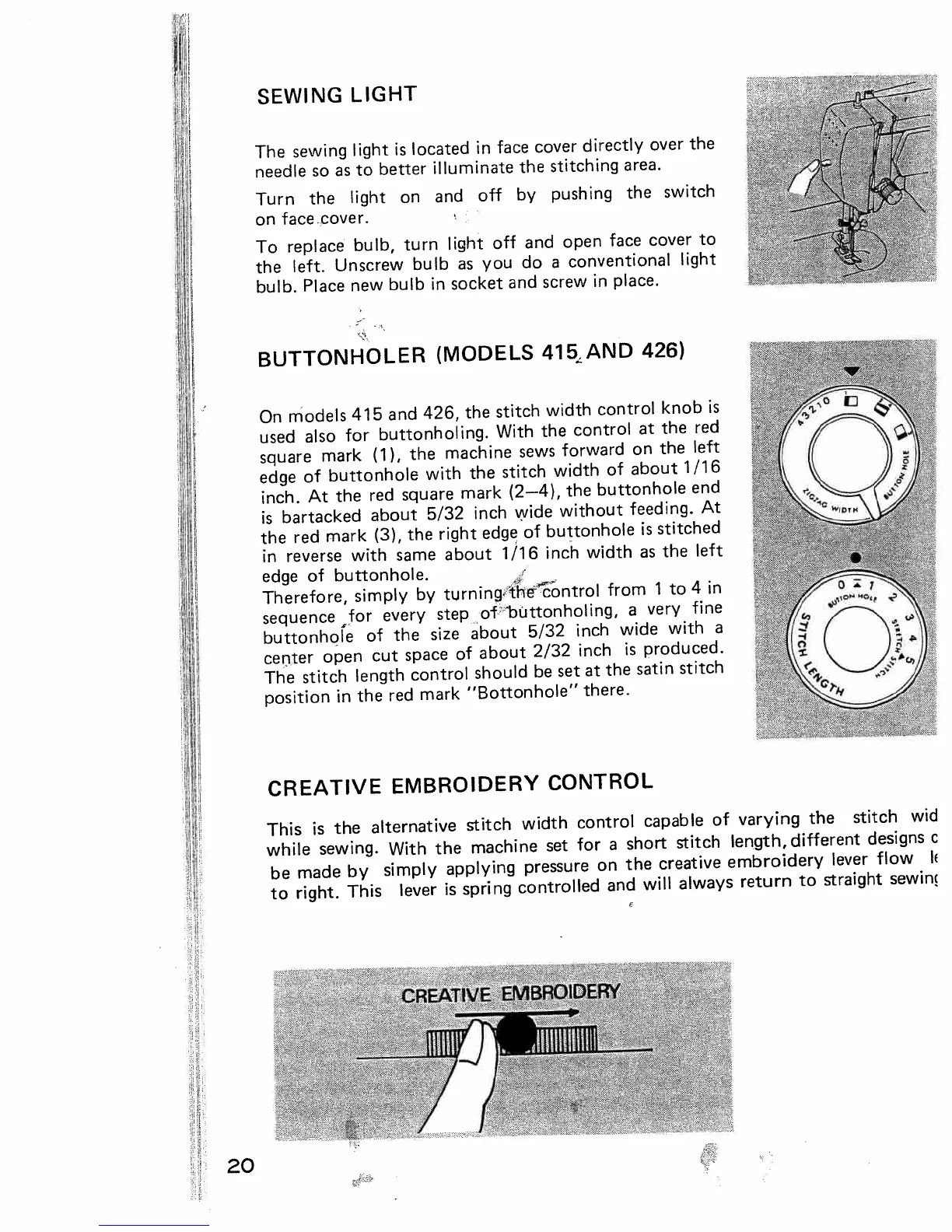 White 404 - SEWING LIGHT; BUTTONHOLER (MODELS 415 AND 426); CREATIVE EMBROIDERY CONTROL