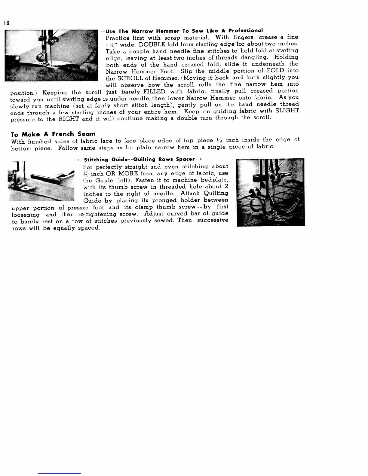 White 656 - Specialized Sewing Techniques; Using the Narrow Hemmer; Sewing a French Seam; Using the Quilting Rows Spacer