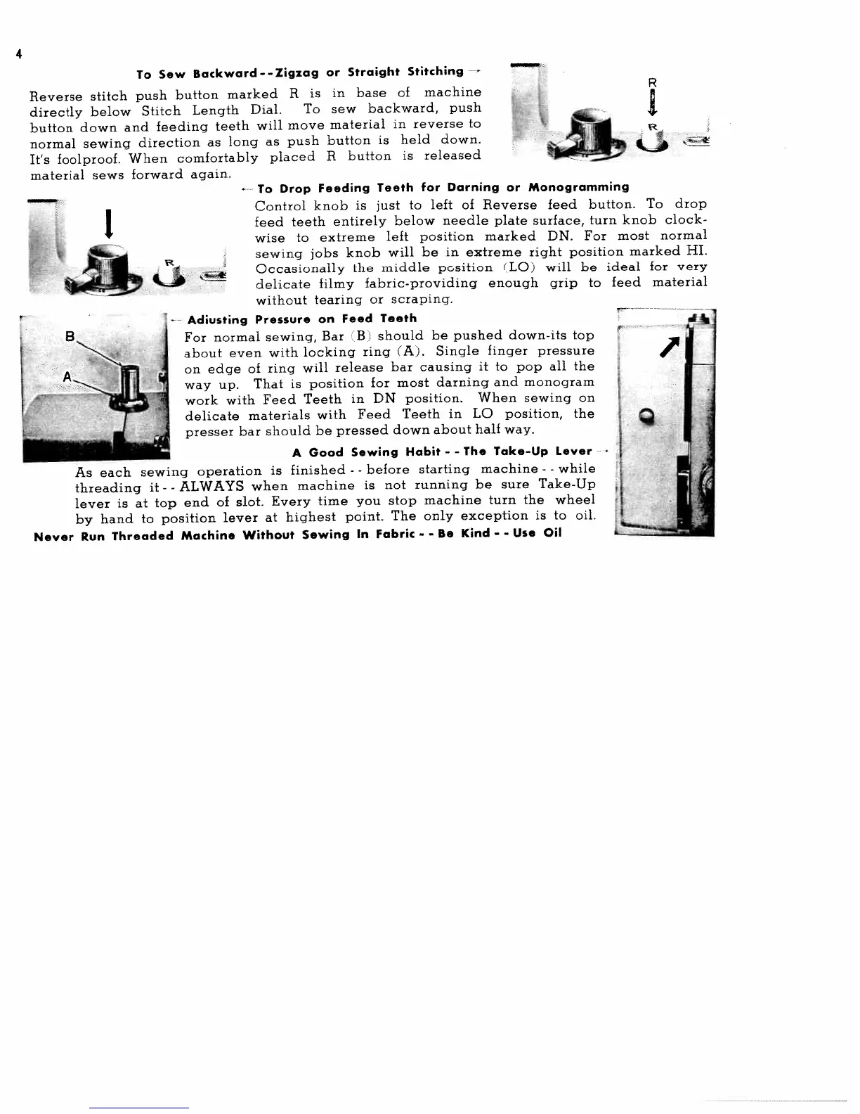 White 656 - Advanced Machine Operations; Sewing in Reverse Direction; Darning and Monogramming Setup; Feed Teeth Pressure Control