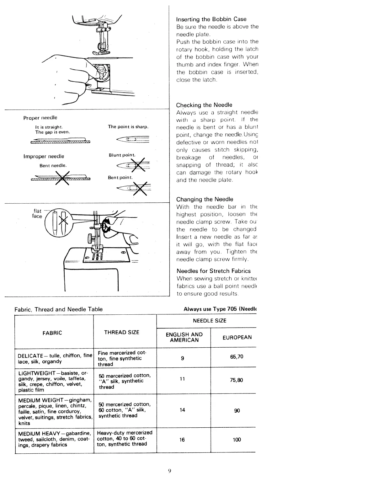 White 8000 - Inserting the Bobbin Case; Checking the Needle; Changing the Needle; Fabric, Thread and Needle Table