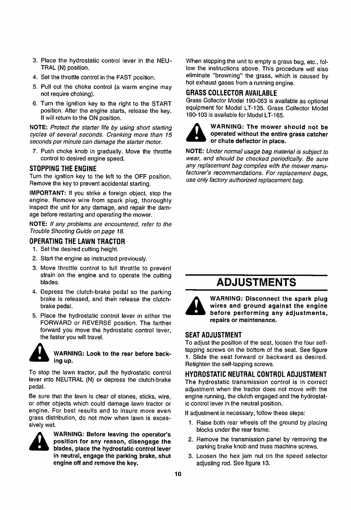 White LT-135 - Stopping the Engine; Engine Stopping Procedure; Operating the Lawn Tractor; Lawn Tractor Operation