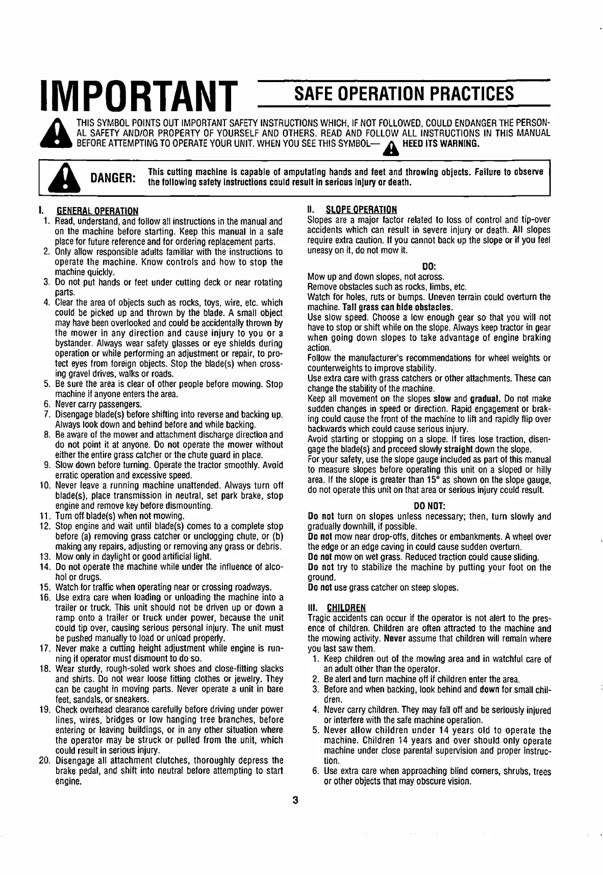 White LT-135 - Safe Operation Practices; General Operation Safety; Safe Slope Operation; Child Safety Precautions