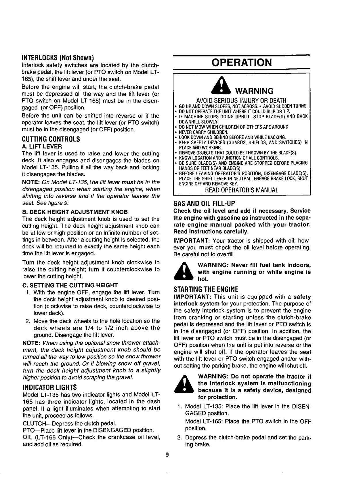 White LT-135 - Safety Interlock System; Interlock System Functionality; Cutting Controls; Lift Lever Operation
