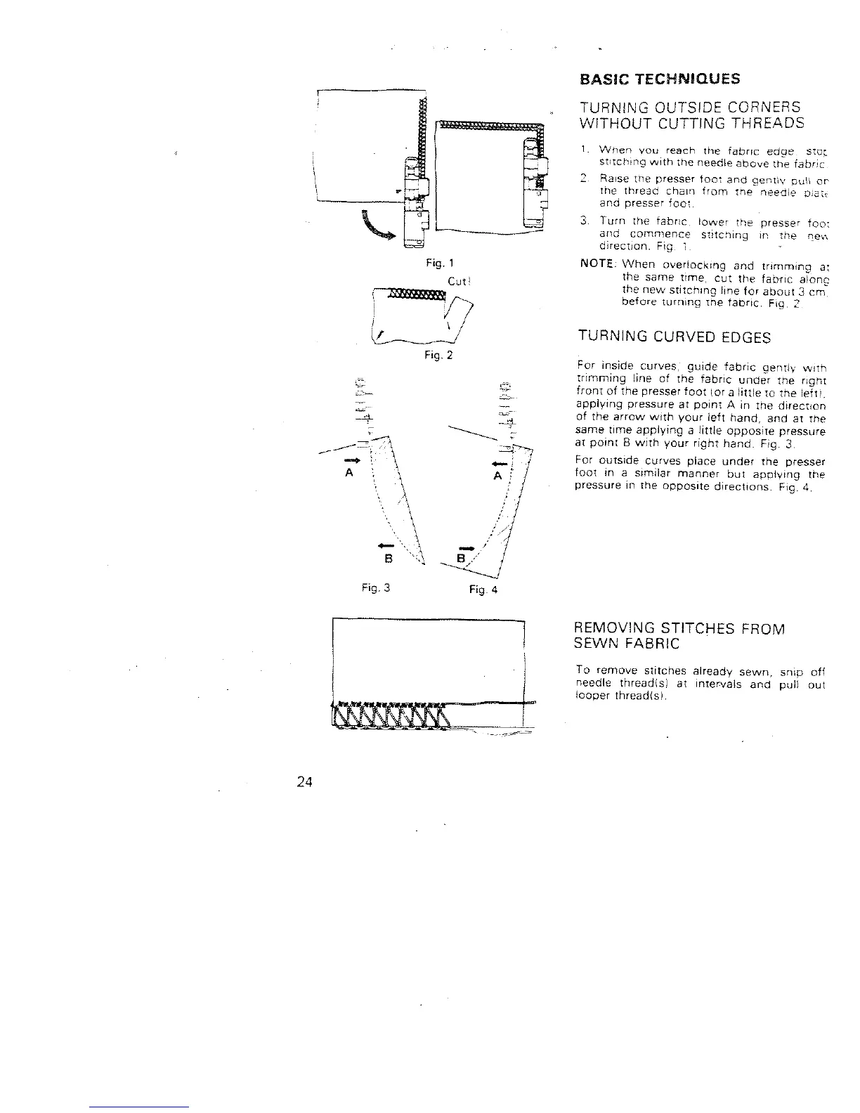White Super Lock 734 - Basic Techniques; Turning Outside Corners Without Cutting Threads; Turning Curved Edges; Removing Stitches from Sewn Fabric