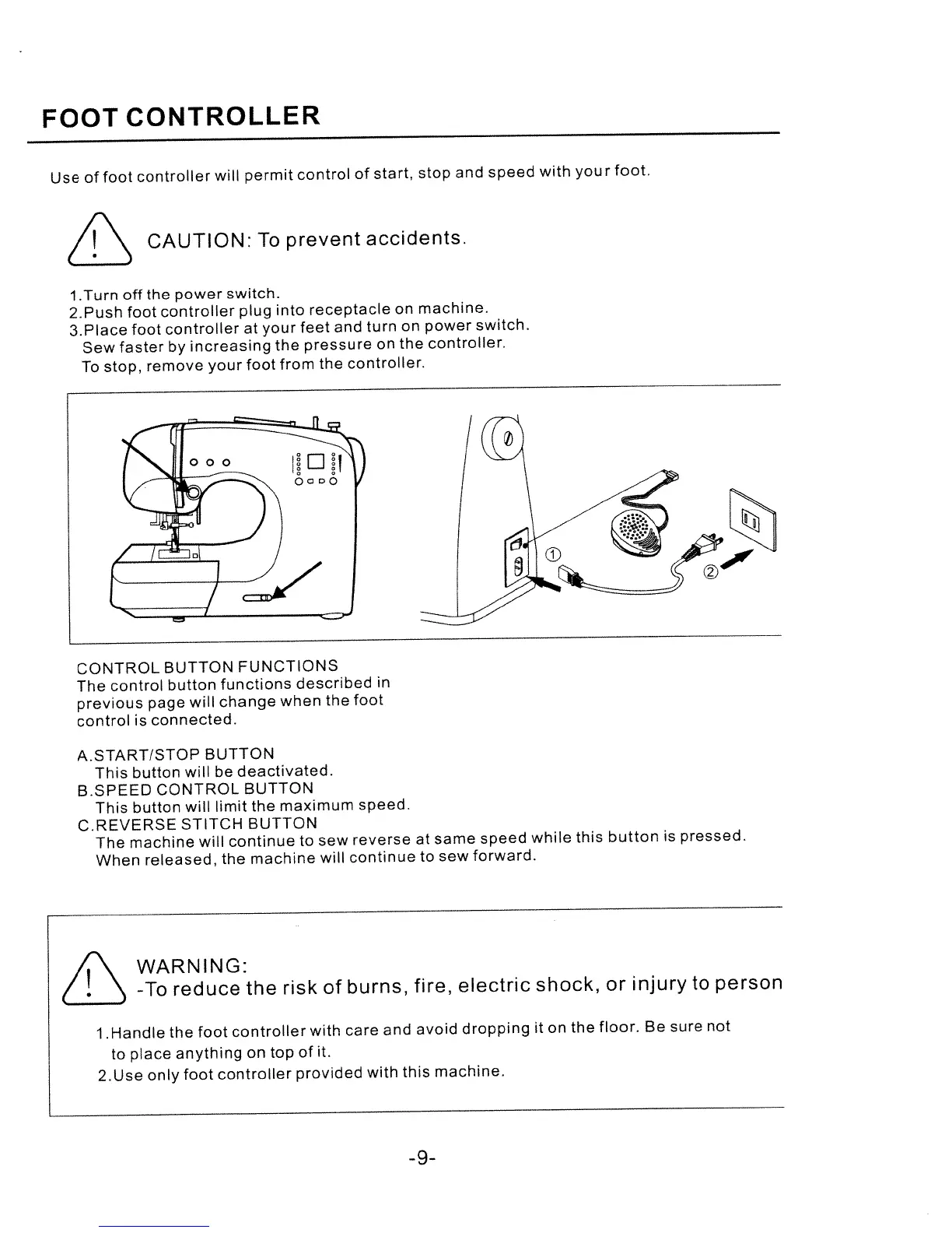White W1750C - Foot Controller Operation; Control Button Functions with Foot Controller