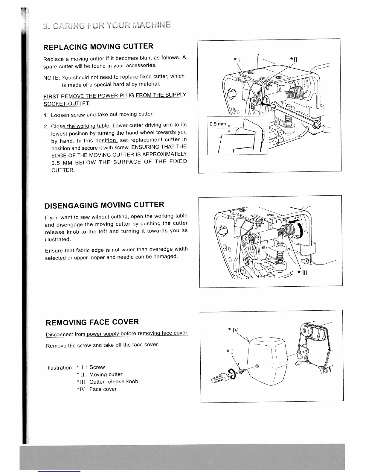 White W2500 Superlock - Caring for Your Machine; Replacing Moving Cutter; Disengaging Moving Cutter; Removing Face Cover