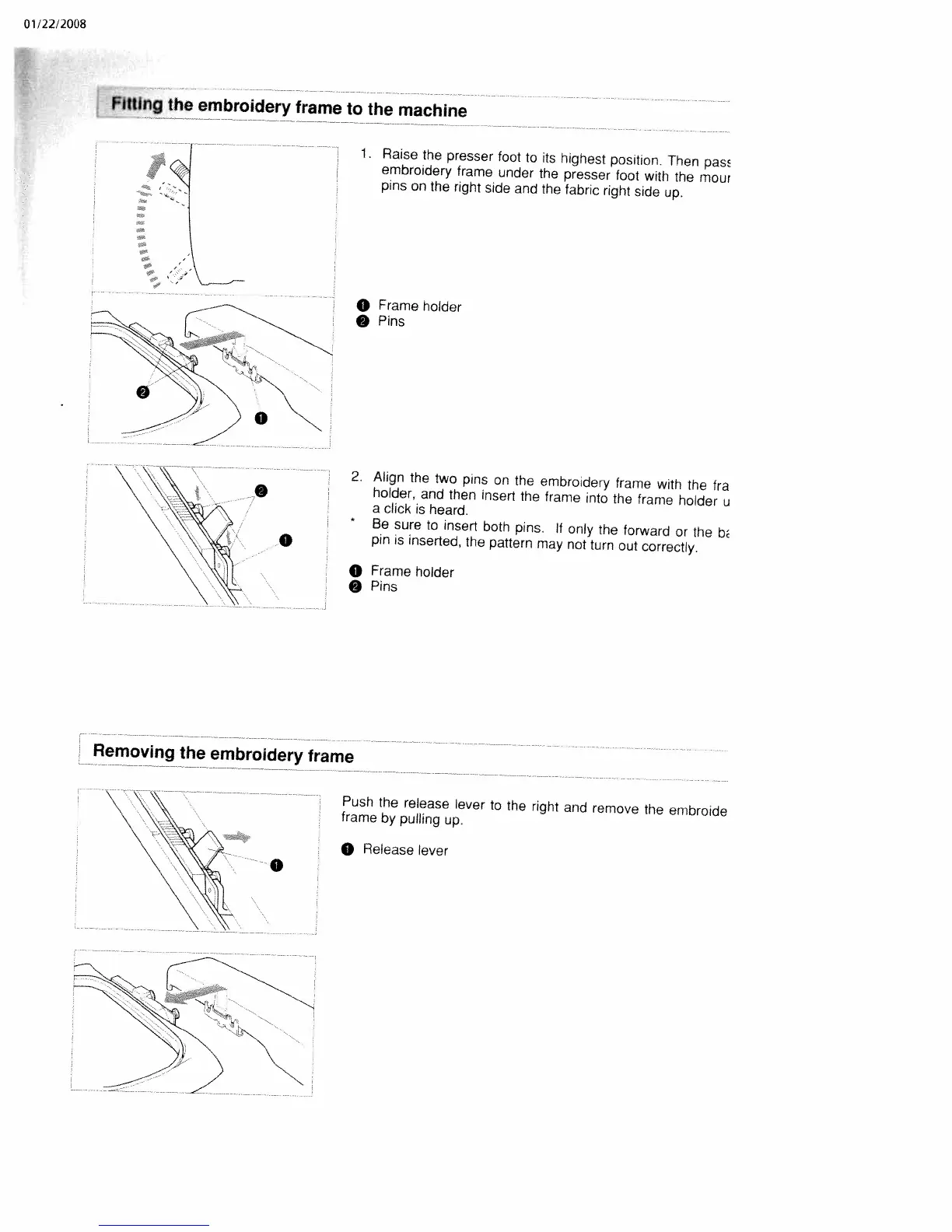 White W3300 - Fitting the Embroidery Frame to the Machine; Align Frame Holder and Pins; Removing the Embroidery Frame