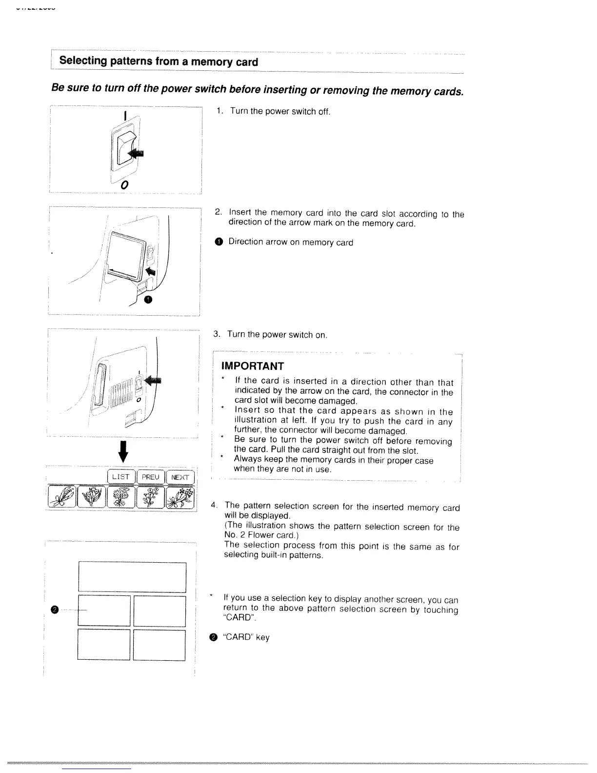 White W3300 - Selecting Patterns from a Memory Card; Insert Memory Card; Important Card Handling Warnings