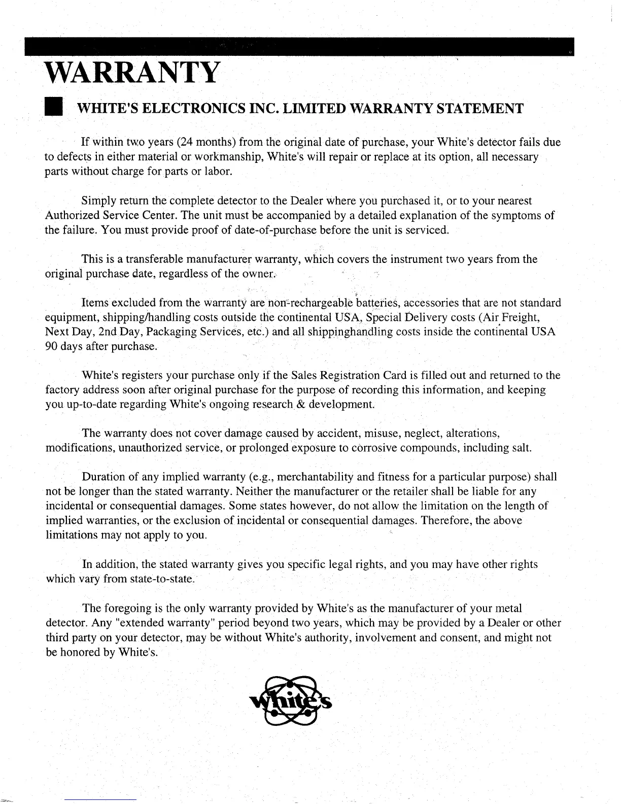 White’s Electronics Quantum II - Warranty; Whites Electronics Inc. Limited Warranty Statement
