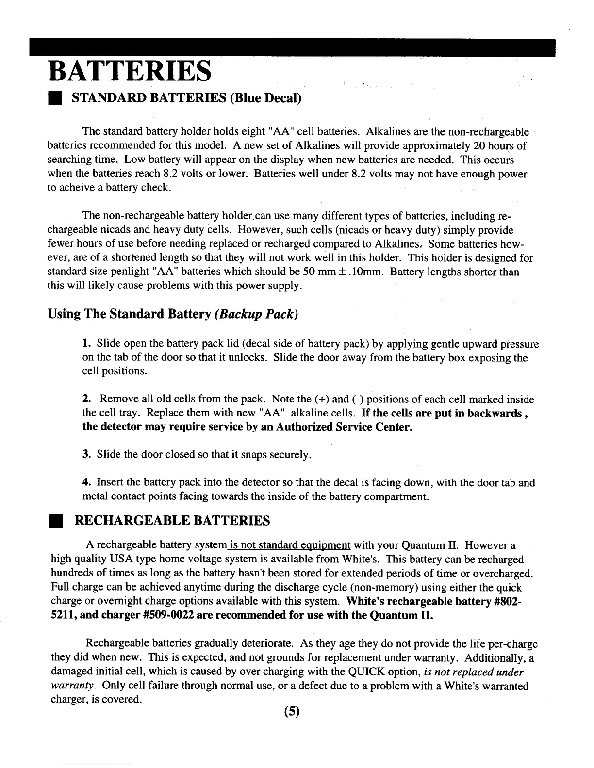 White’s Electronics Quantum II - Batteries; Standard Batteries; Using The Standard Battery; Rechargeable Batteries