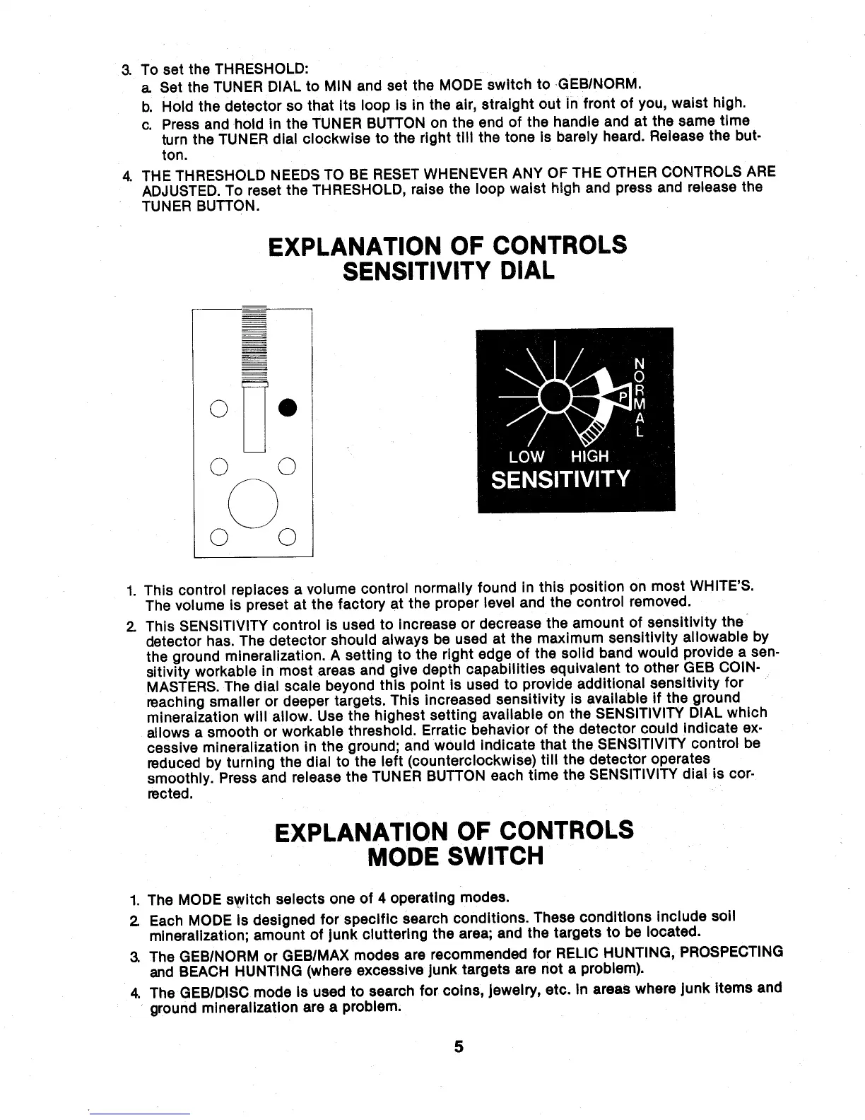 Whites 4900/D PRO PLUS - Sensitivity Dial and Mode Switch; Sensitivity Dial Function; Mode Switch Selection