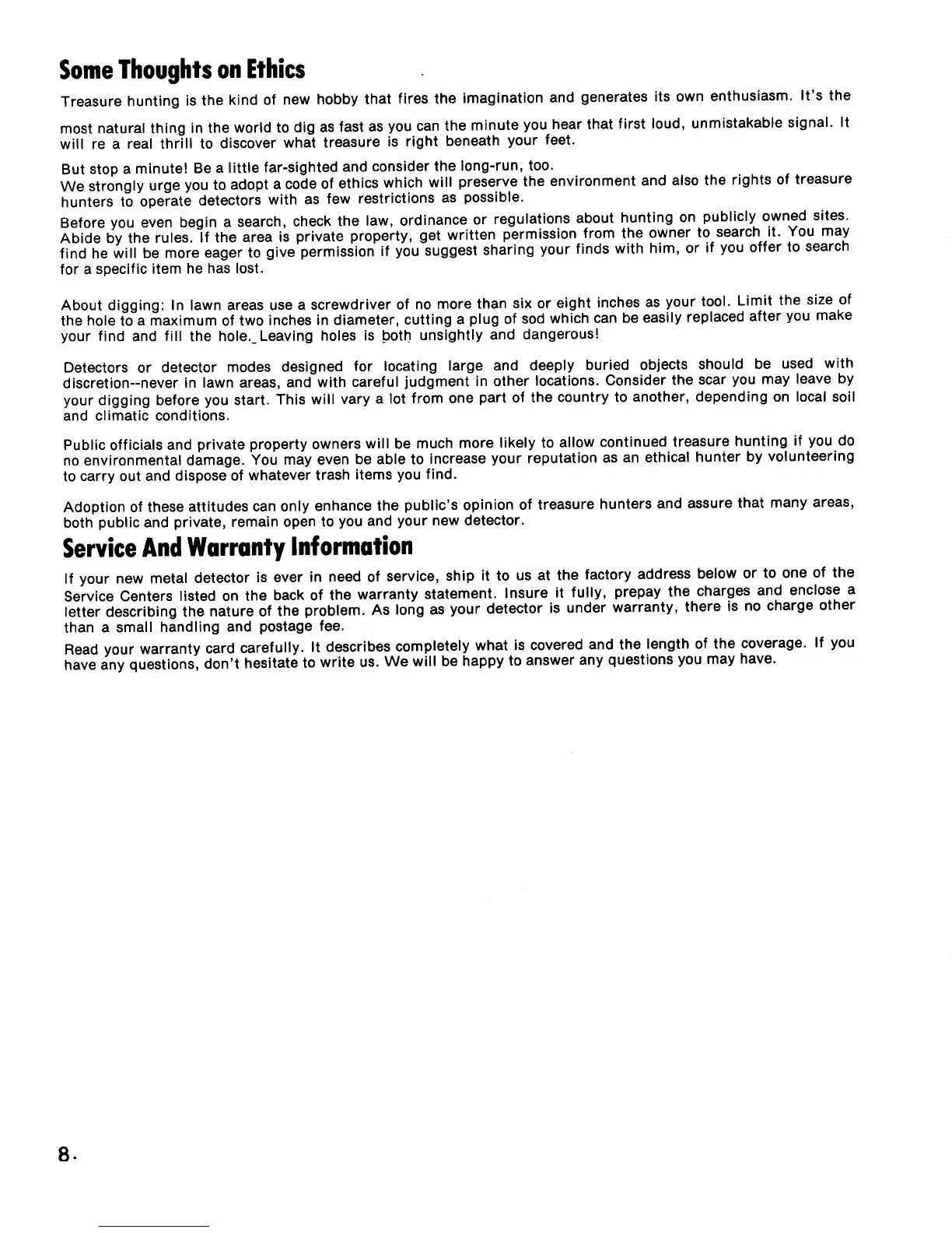 Whites Coinmaster 4/DB - Ethical Treasure Hunting; Service and Warranty Information