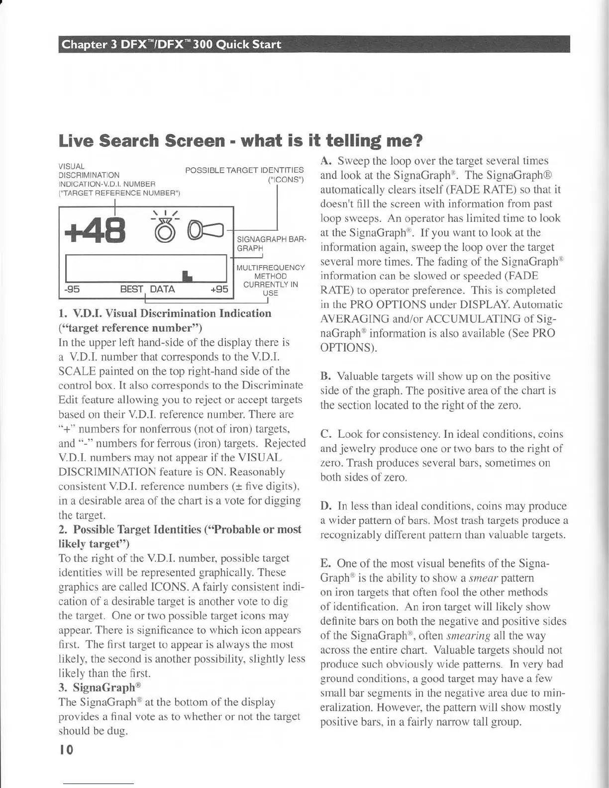 Whites DFX - Live Search Screen - What Is It Telling Me?; V.D.I. Visual Discrimination Indication; Possible Target Identities; Signagraph