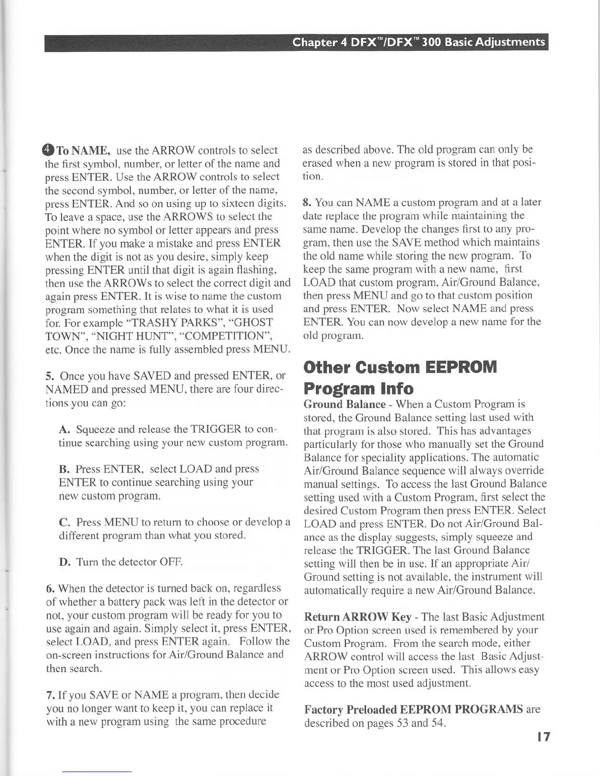 Whites DFX - Other Custom EEPROM Program Info; Ground Balance; Return Arrow Key; Factory Preloaded EEPROM Programs