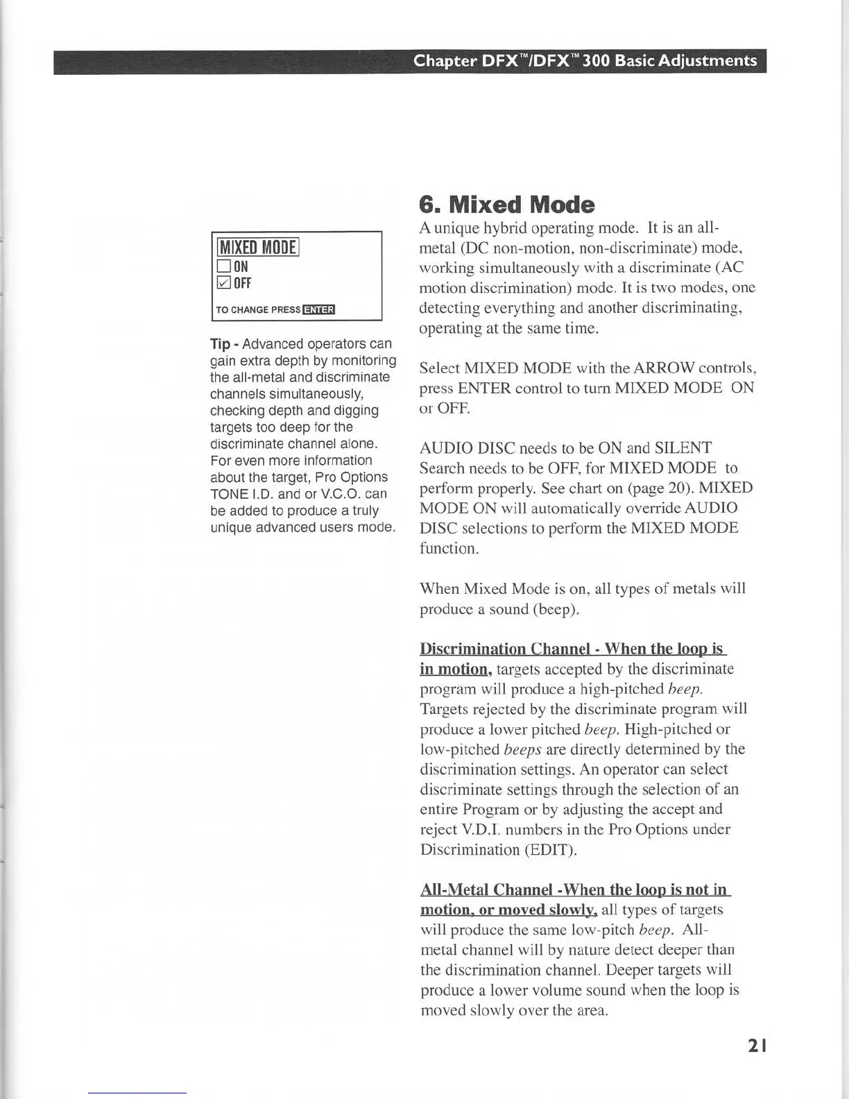 Whites DFX - Mixed Mode; Discrimination Channel - When the Loop Is in Motion; All-Metal Channel - When the Loop Is Not in Motion or Moved Slowly
