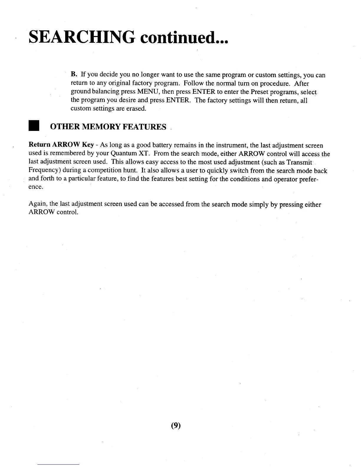 Whites Quantum XT - Other Memory Features; Return Arrow Key